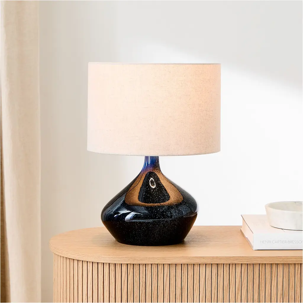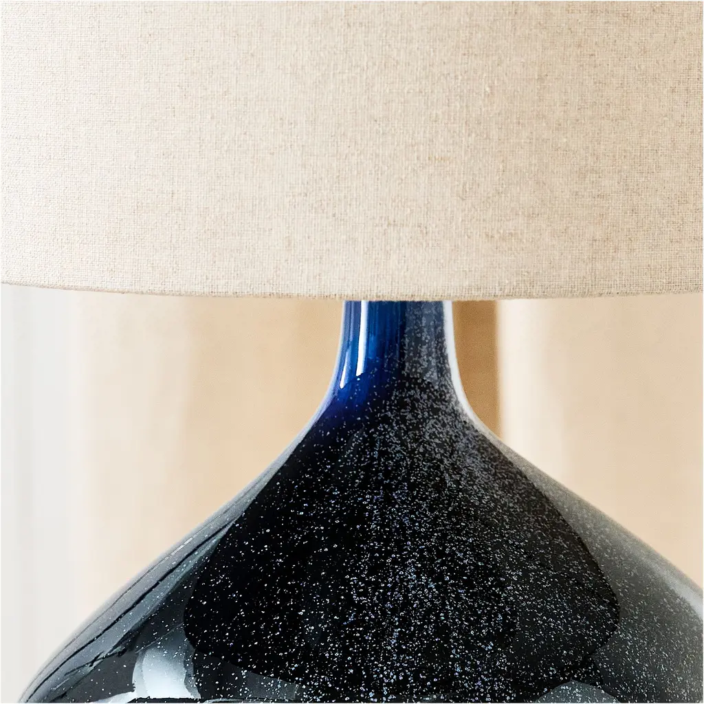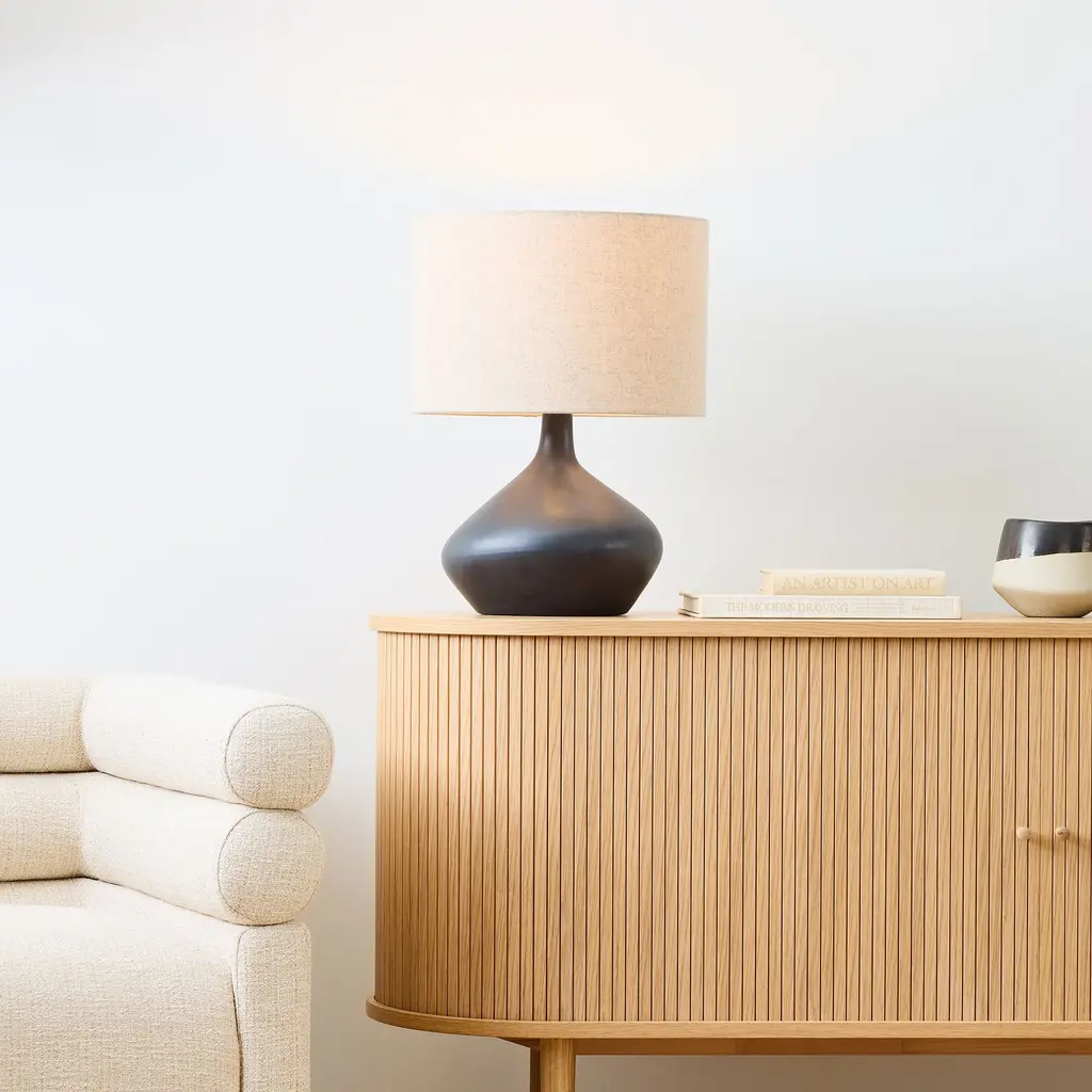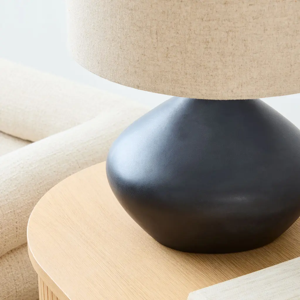 The unique, organically shaped base. It's topped with a pure linen shade. Offers an ambient diffused light. Contract Grade, so you know it's built to last.
