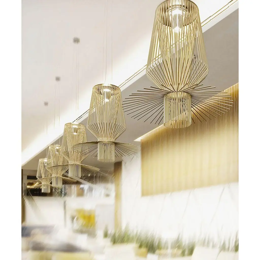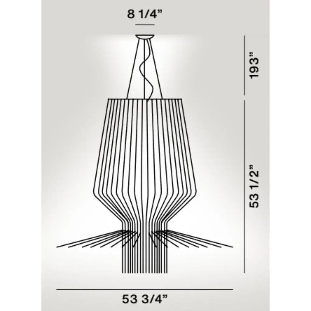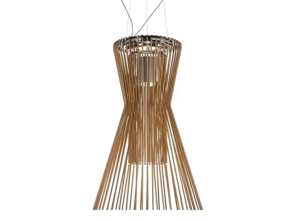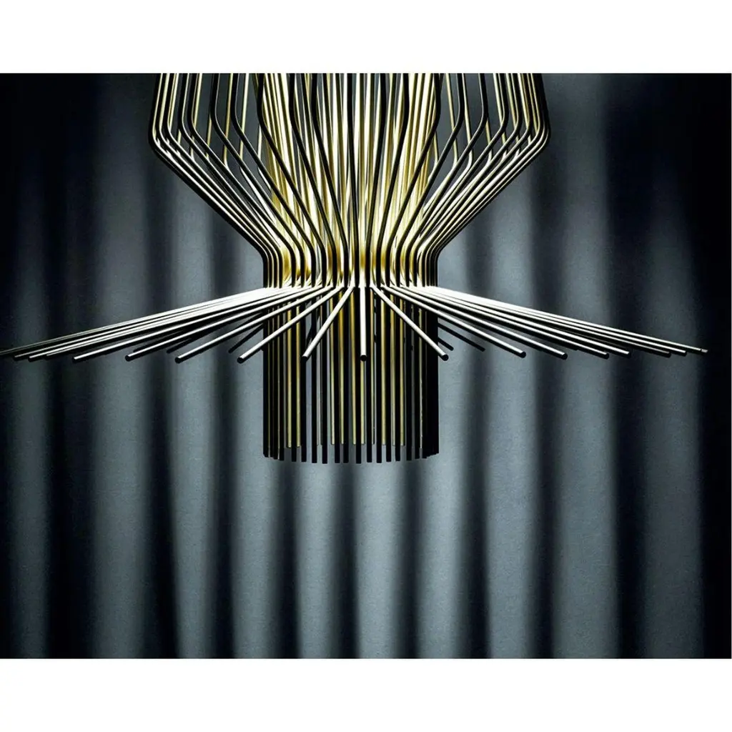 Atelier Oi ‘Allegro Assai’ LED chandelier lamp in gold for Foscarini.Designed by Atelier Oi and produced by Foscarini, the Italian lighting firm founded in Venice on the legendary island of Murano, where generations of master craftsman have skillfully used their unmatched imagination and skill to create the most innovative works of light in the modern era. The ‘Allegro Assai’ is fabricated using many of the same artisanal techniques perfected over centuries, with thoughtful attention to detail, use of high quality materials and incomparable rigor and passion. The 'Allegro Assai's' distinguished features are executed with a chromed metal frame and expertly completed by shaped powder-coated aluminum rods lacquered with gold paint. The result is a brilliant display of downward diffused light with shadows cast upward along the ceiling, making this chandelier the perfect statement piece to accentuate a large space.Price per item. In stock and available to order in unlimited quantities. Also available to order in a smaller size as the 'Allegretto Assai' as well as in variety of additional shapes, please see our separate listings for the Allegro Ritmico or Allegro Vivace.In stock lead time 2 weeks. Out of stock can add 12 weeks or more. Please note that inventory availability can change without notice. Please contact us for current availability and lead times prior to placing time sensitive orders.Illuminated with integrated 56 watt LED providing 5684 maximum lumens with 3000k color at a CRI >90. Dimmable according to switch (switch not included). This lamp is ETL listed. Not UL listed, but recommended UL listing possible from an authorized 3rd party vendor for an additional fee. All sales final.