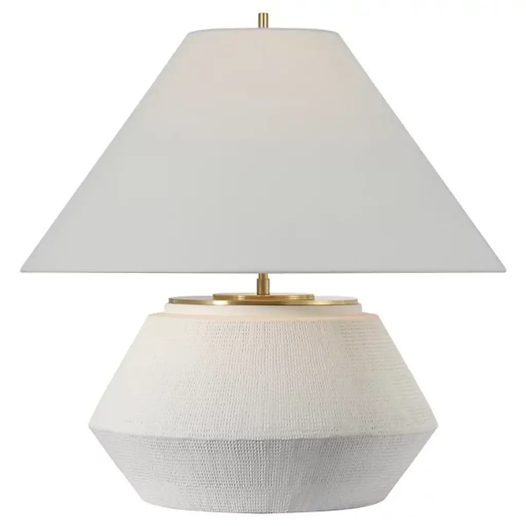 The Aten Table Lamp from Visual Comfort Signature celebrates the natural beauty of ceramic with its tactile, textured base that brings subtle dimension to any surface. Brass accents complement the earthen quality of the ceramic, adding refined touches to Thomas O'Brien's thoughtfully balanced design. This lamp brings casual refinement to living spaces, bedrooms, or studies where its presence feels simultaneously substantial and light. The ceramic foundation connects the piece to ancient pottery traditions while maintaining a thoroughly modern sensibility. Its understated character allows it to integrate effortlessly into diverse design contexts while providing ideal illumination for daily activities.