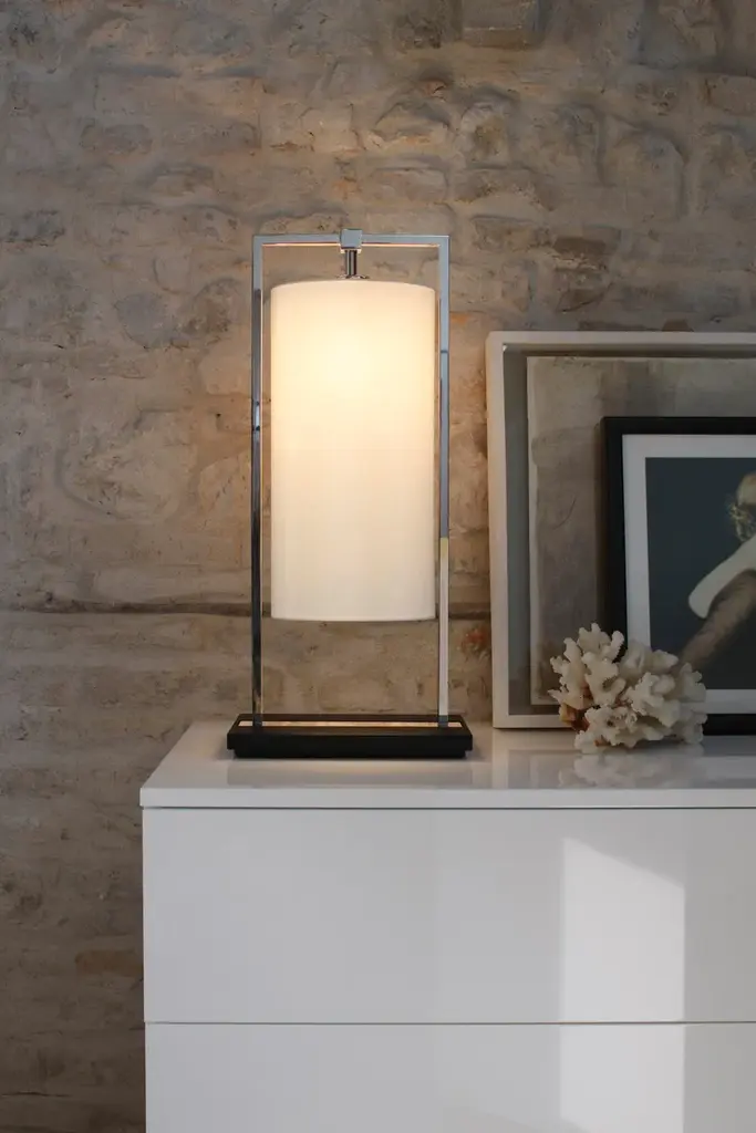 Athena is a table lamp characterised by rectangles (the base) and ovals (the shade) that blend together. The shade can be made with highly tactile fabrics, in linen or percaline, for a couture touch. The base is in dark brown stained oak with black nickel finish inserts to reaffirm a sense of balance. Athena stands as a real "passepartout".Light source1 X E27LED light bulb
