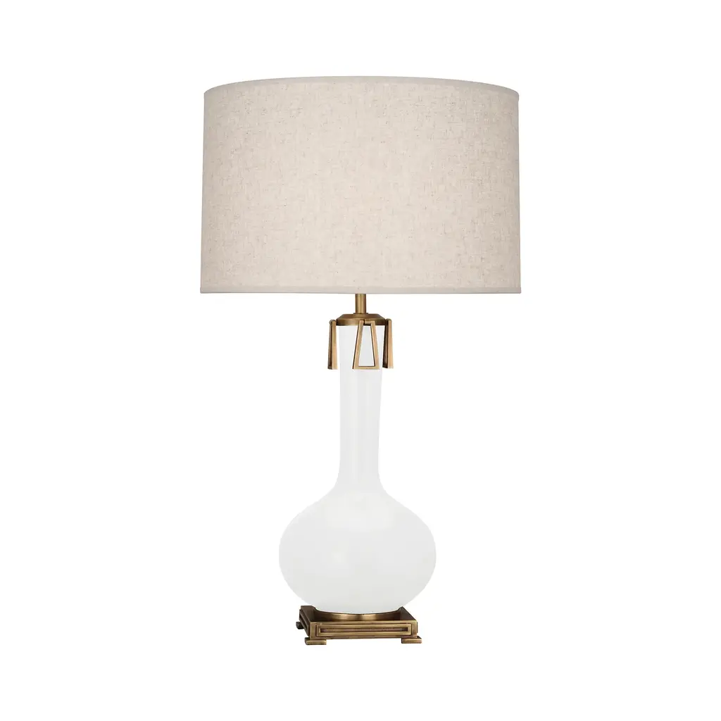 The Athena Table Lamp from Robert Abbey combines classical inspiration with contemporary elegance. Its bone-glazed ceramic body, shaped like a refined urn, is elevated by a contrasting metal pedestal. An elongated neck topped with a circular brass motif leads to a neutral linen shade, creating a sophisticated and timeless lighting piece perfect for any refined interior. Highlights