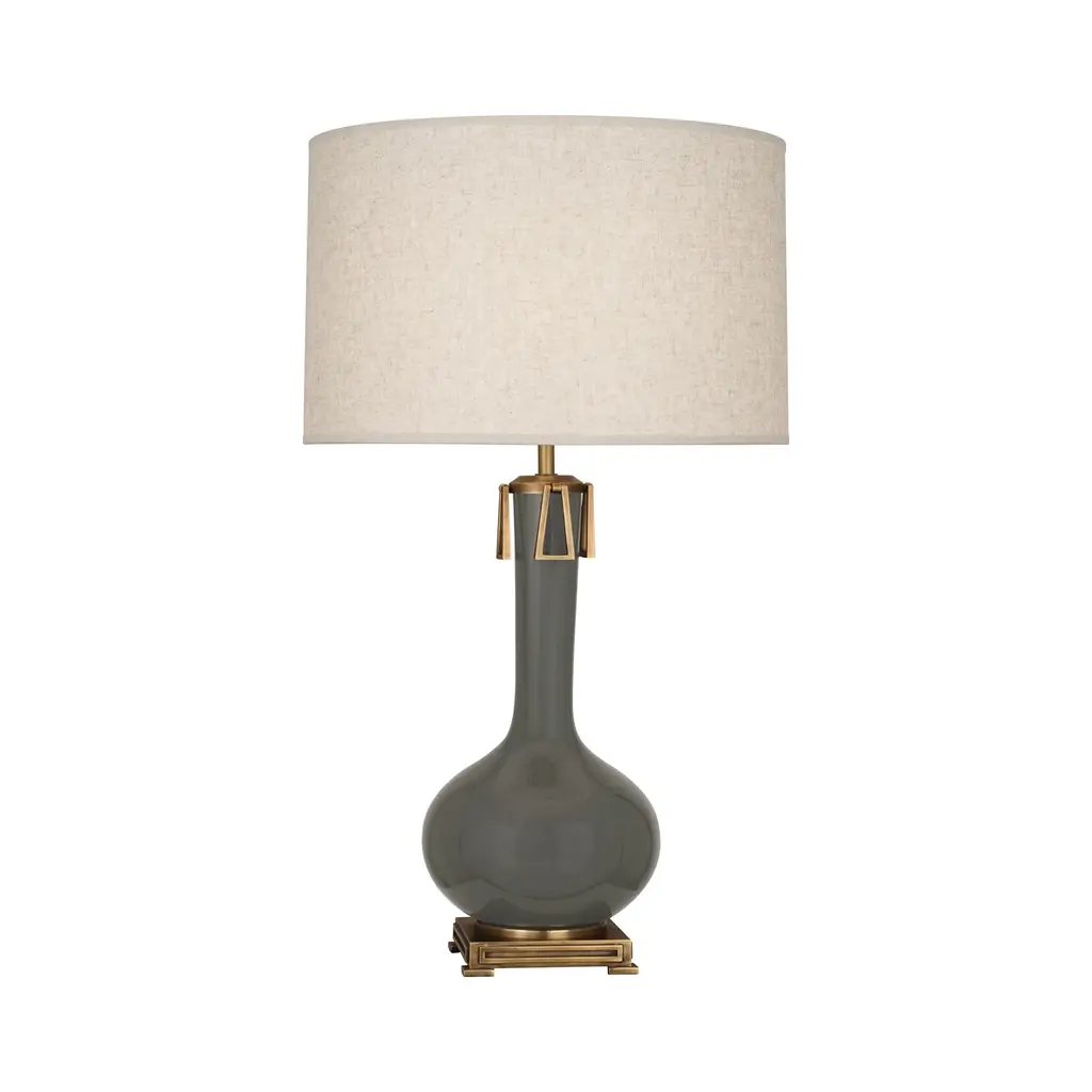The Athena Table Lamp from Robert Abbey combines classical inspiration with contemporary elegance. Its bone-glazed ceramic body, shaped like a refined urn, is elevated by a contrasting metal pedestal. An elongated neck topped with a circular brass motif leads to a neutral linen shade, creating a sophisticated and timeless lighting piece perfect for any refined interior. Highlights