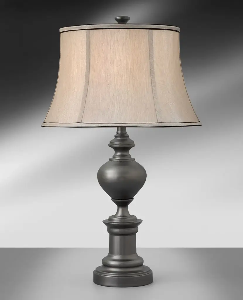 Standard Lamp Specifications for #GM985:Product Type: Table LampHeight: 28"Finish: Gun MetalConstruction: SteelSocket: (1) Aluminum 3-way Med. Base Type A 150W Max socket(s). (Bulb(s) not included)Switching: (1) 3-way turn knob switch(es) located on the socket.Cord: 6''5'' (from base) long brown SPT-2 cord set with a 2 prong polarized plug.UL/CUL and/or ETL listed: YesHarp Size: 8 inches (including the saddle)Standard Packing: 2 per carton (shade packed separately).Lamps & Shades per SKU: 2Lamping: (1) Aluminum 3-way Med. Base Type A 150W Max socket(s).Shade Size and Description: Grey Silk Drum bell shade with Black underfold trim measuring 12" x 16" x 10" w/ .5" drop (Top x Bottom x Slant).Bulb Included: NoMaterial Description: constructed from polished, plated, and lacquered steel.