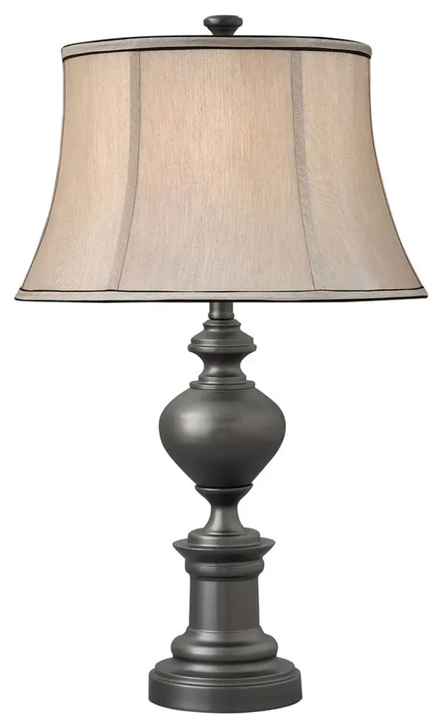 Standard Lamp Specifications for #GM985:Product Type: Table LampHeight: 28"Finish: Gun MetalConstruction: SteelSocket: (1) Aluminum 3-way Med. Base Type A 150W Max socket(s). (Bulb(s) not included)Switching: (1) 3-way turn knob switch(es) located on the socket.Cord: 6''5'' (from base) long brown SPT-2 cord set with a 2 prong polarized plug.UL/CUL and/or ETL listed: YesHarp Size: 8 inches (including the saddle)Standard Packing: 2 per carton (shade packed separately).Lamps & Shades per SKU: 1Lamping: (1) Aluminum 3-way Med. Base Type A 150W Max socket(s).Shade Size and Description: Grey Silk Drum bell shade with Black underfold trim measuring 12" x 16" x 10" w/ .5" drop (Top x Bottom x Slant).Bulb Included: NoMaterial Description: constructed from polished, plated, and lacquered steel.