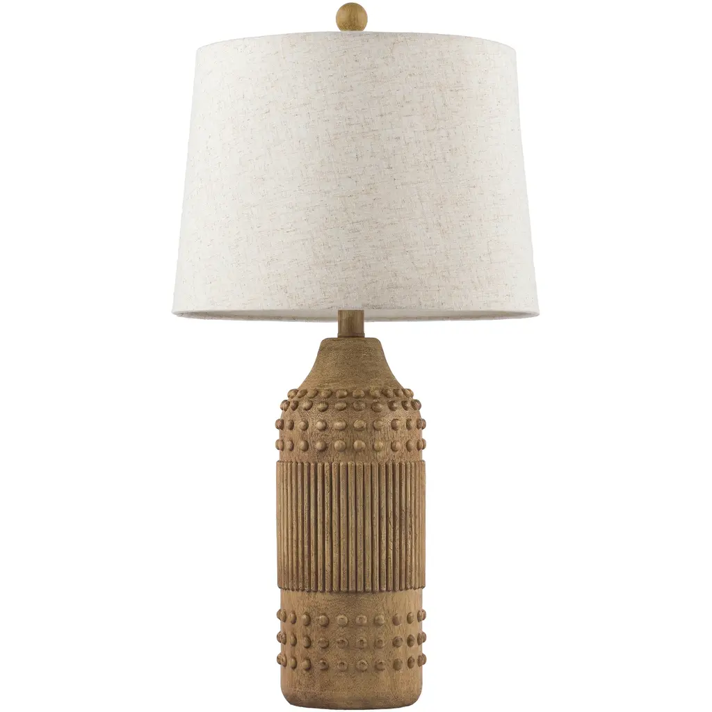 An ode to global-inspired design, this Athiya table lamp showcases an embellished base, capped with a linen shade. Beaded and ribbed detailing on the cylindrical body fills this fixture with texture and beauty. A captivating accessory beside your bed or at the end of a sofa or sectional. This table lamp has a hand-finished base that mirrors the look of natural wood. A perfect choice for many decor styles, including rustic, farmhouse, and transitional. Made in China. This item is UL/CUL certified and accommodates a 100W bulb. For optimal product care, wipe clean with a soft cloth.