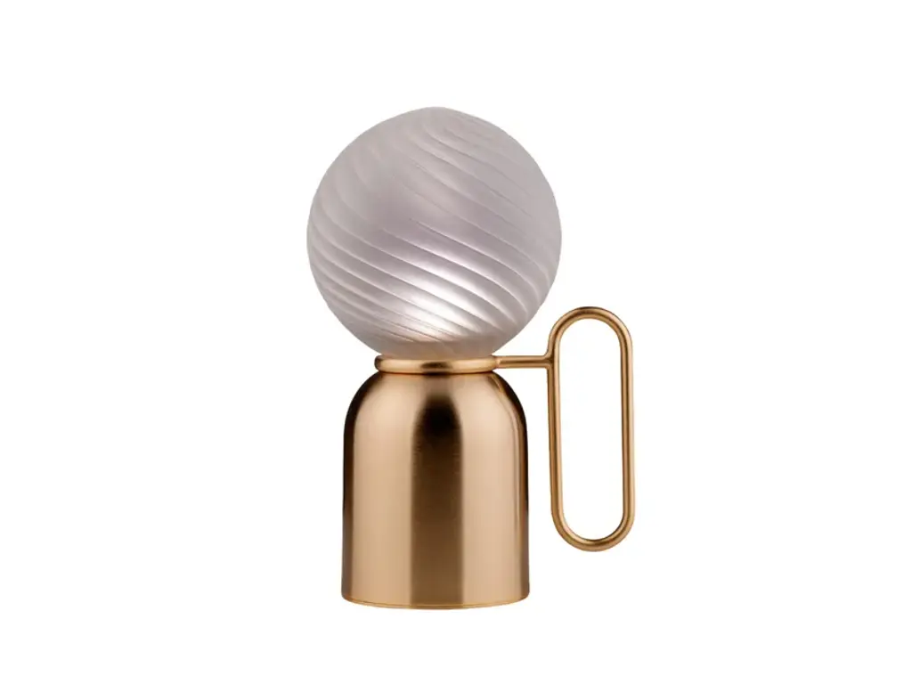 The Atlas rechargeable LED table lamp by the Milanese designer Alberto Ghirardello, in addition to being a refined design object, pays particular attention to the need for energy saving and environmental sustainability.Atlas is a versatile table lamp with a small size and a fine and graceful appearance, discreet but at the same time with an incisive and recognizable character.Lamp with metal, aluminum and brass components. Borosilicate spheres with vertical striped texture and twisted striped. Possibility to request Atlas lamp with cable and bulb G9 - 220 Vdc and Atlas battery lamp with led and rechargeable battery system LI- Po (lithium and lithium polymers) 8000 mhA. Nominal duration 8 H. Ignition and dimming with touch button.Atlas battery lamp1 cobled - 2 W - 4000°K - 2,7 Vdc - 440 Lm dimmable: yesAtlas lamp1 G9 bulb - max 6 W - 220 Vdc dimmable: yes