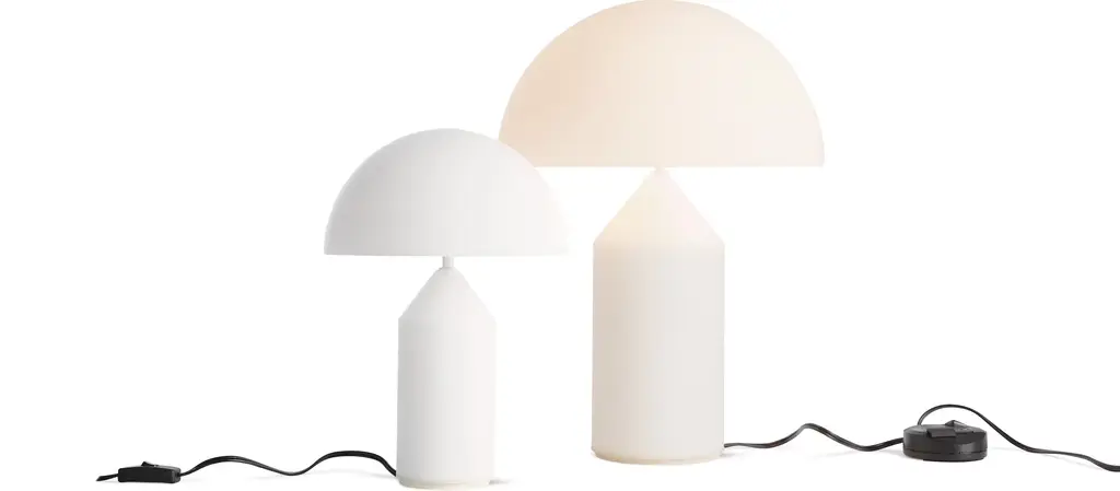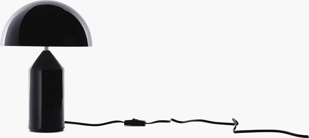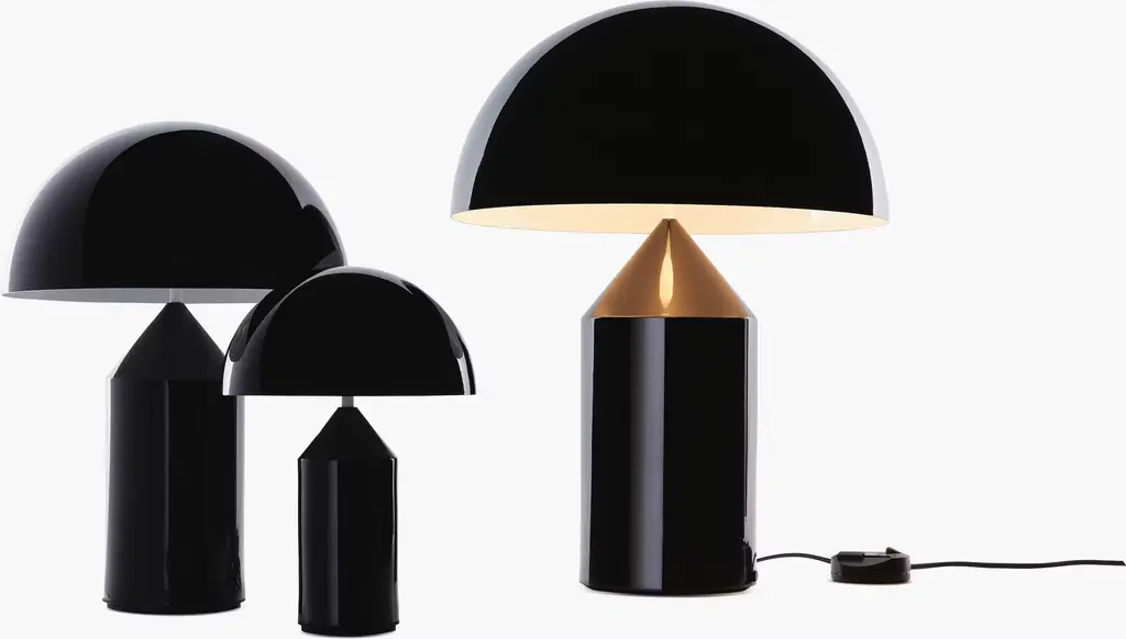 The Atollo Table Lamp (1977) is marked by its minimal geometric construction, featuring a domed glass diffuser resting atop a cylindrical glass base. Both of these house bulbs to provide direct and ambient light that's easily controlled via an on-cord dimmer switch (medium and large sizes only). Atollo resides in the permanent collections of the world's foremost design museums. Bulbs: three E12 in the small size (not included); two E26, one E12 in medium and large glass (included); E26, E12 in medium and large metal (included). UL Listed. Made in Italy.
