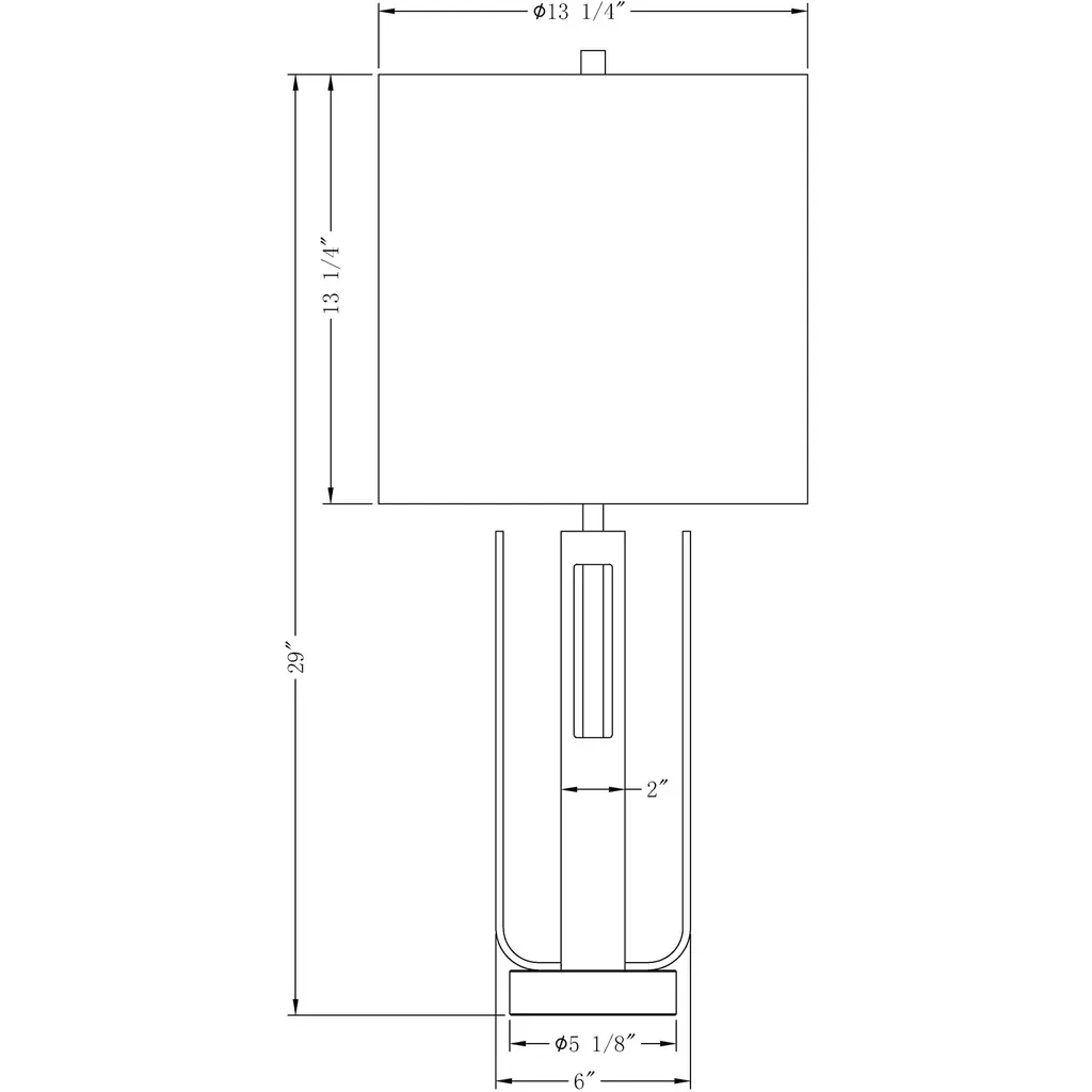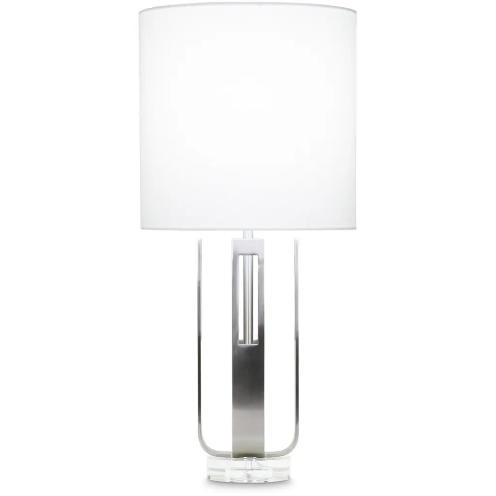 A play on negative space makes this table lamp a work of art. Four segments of Brushed Nickel-finished metal are bent into a graceful shape and set atop a crystal base — plus topped with a crisp White shade — for an upscale look. Place this unique table lamp on a living room end table or in an entryway. Also available in an antique brass finish and bronze finish.