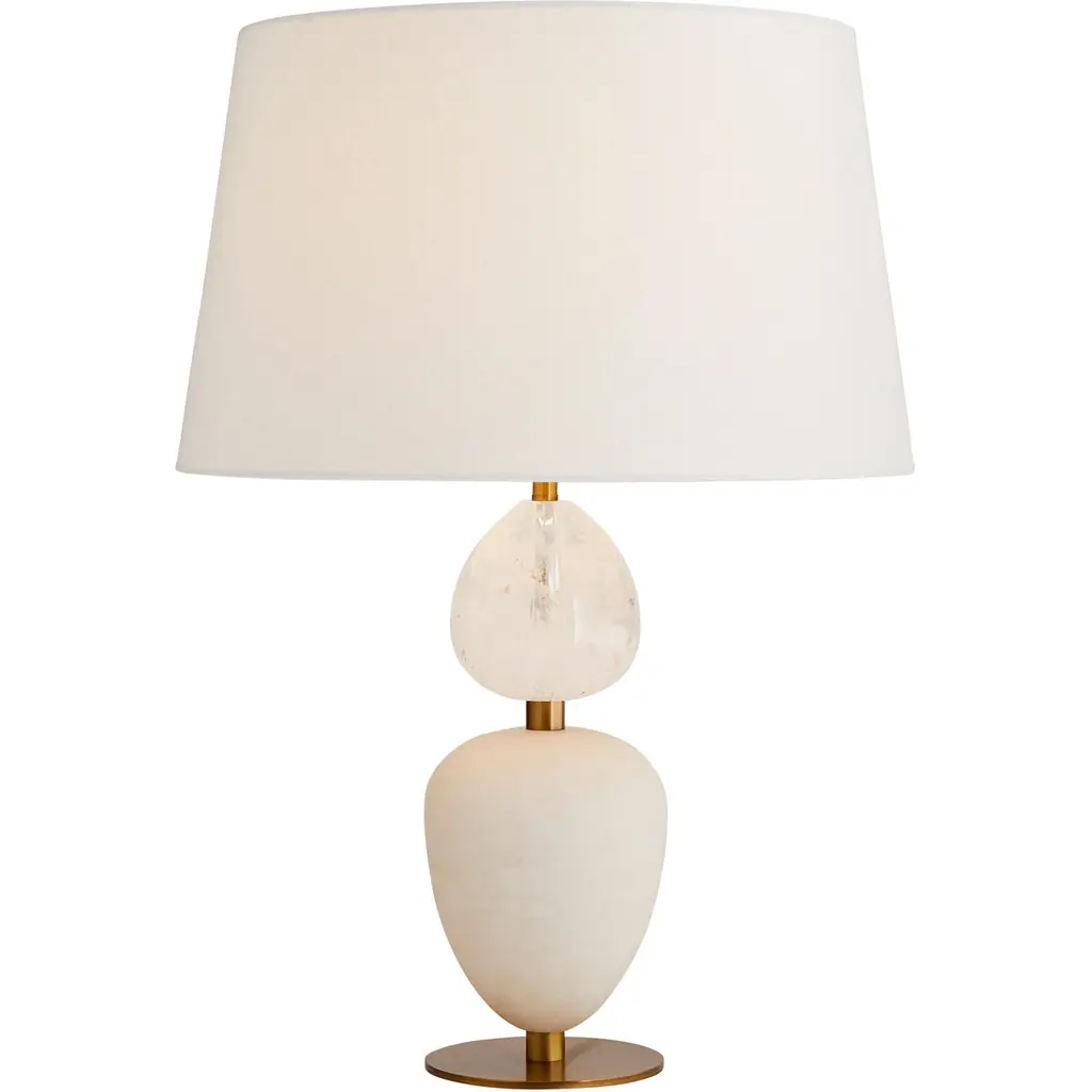 Defined by architectural elements and natural materials the Aubrey is a showpiece by any standard. A polished steel base finished in antique brass exhibits opal swirl crystal and snow marble orbs that accent as well as elevate its sleek frame. The smooth surface of the crystal is juxtaposed with the slightly textured façade of marble. Topped with an off-white linen tapered shade with off-white cotton lining and a 1" brass sphere finial. Finish may vary.