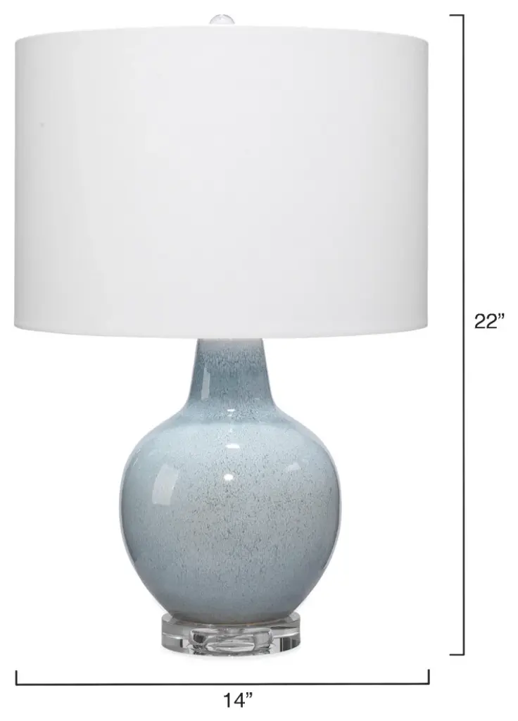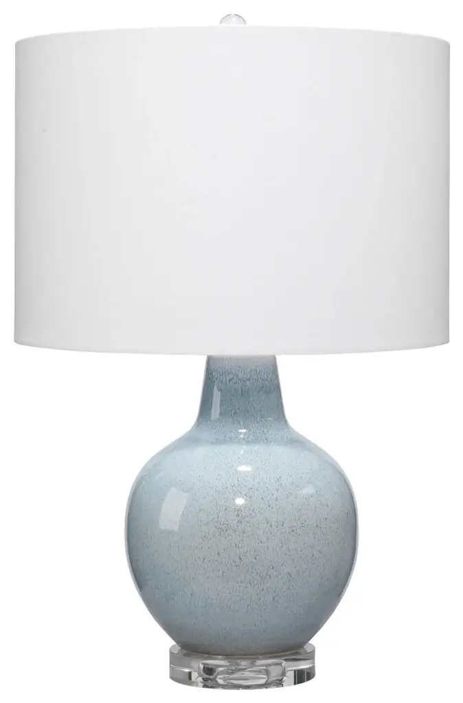 Bring a sense of warmth and serenity to your room with this graceful accent lamp. Crafted of ceramic, each base features a reactive glaze in soft blue and fired individually to achieve a cloudlike effect. A white cotton shade and acrylic base complete the look. Handmade of ceramicWhite Cotton Drum ShadeAcrylic Base: 4.75" W x 4.75"D x .75"H''silver Ball FinialThe handcrafted nature of ceramic creates products with character and individuality. The inherent variations in tone or texture, are preserved, to create pieces rich in detail and natural beauty. These unique imperfections and variations are what define our products, with each piece having its own personality. Lamp Dimensions: 12.5"H x 7.75"W x 7.75"D''shade Dimensions: 9.5"H x 14"W x 14"D1 bulb required; Bulb Not Included100 Max Wattage; 120 VoltsE26 Bulb Base Type 8 Ft Clear Cord3-way SwitchCare Instructions: We do not recommend using harsh or abrasive cleaners at any time as they can damage product. Wipe surfaces gently with soft, dry cloth. If needed, you may use a lightly damp cloth with water only on base.