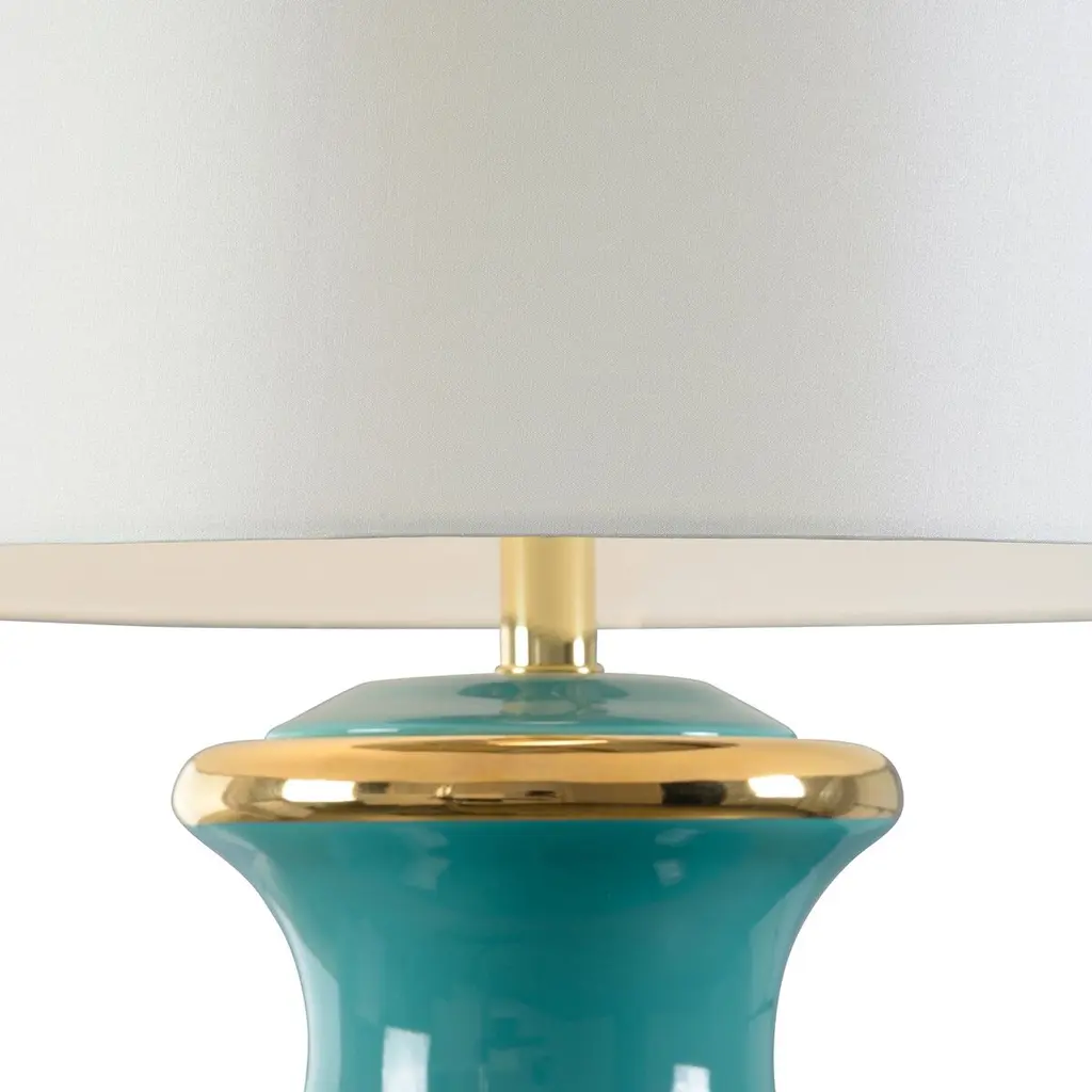 A modern take on an antique lamp softening any space with graceful lines and metallic detailing. Available in a variety of colors. Designed by Shayla Copas.