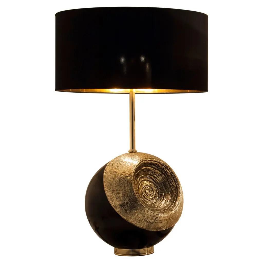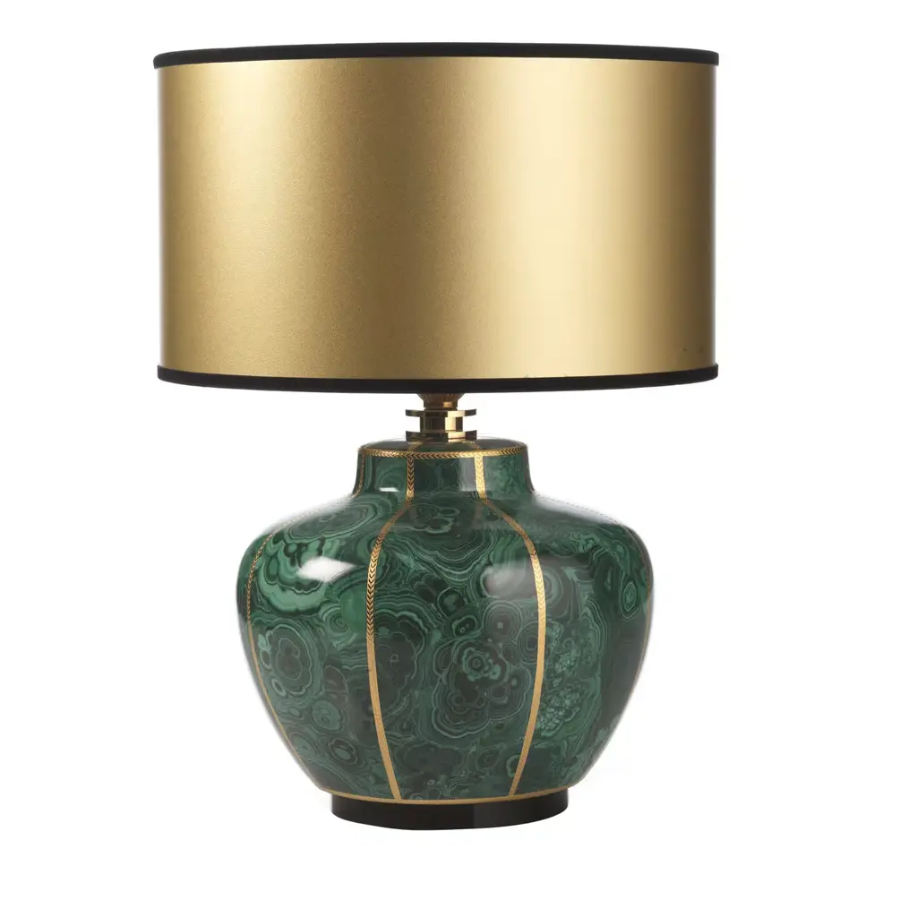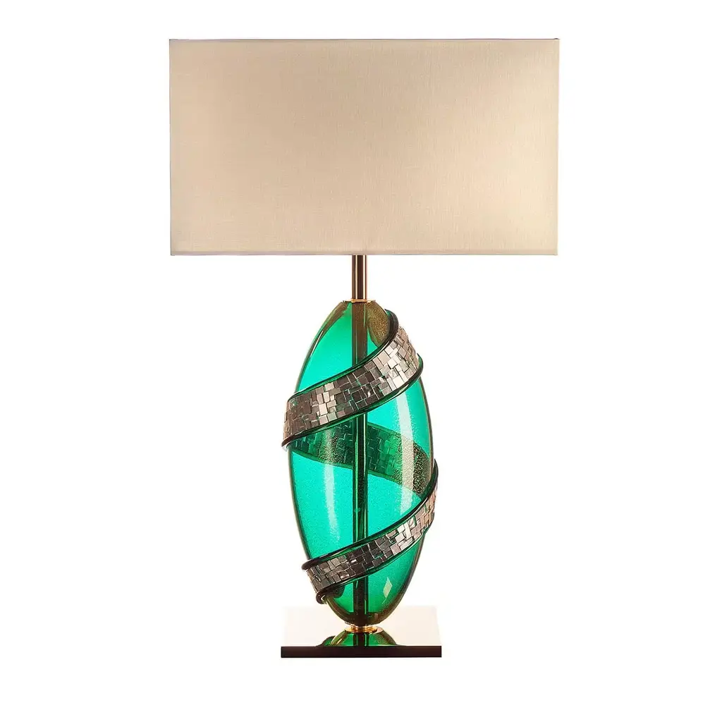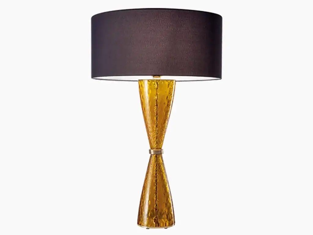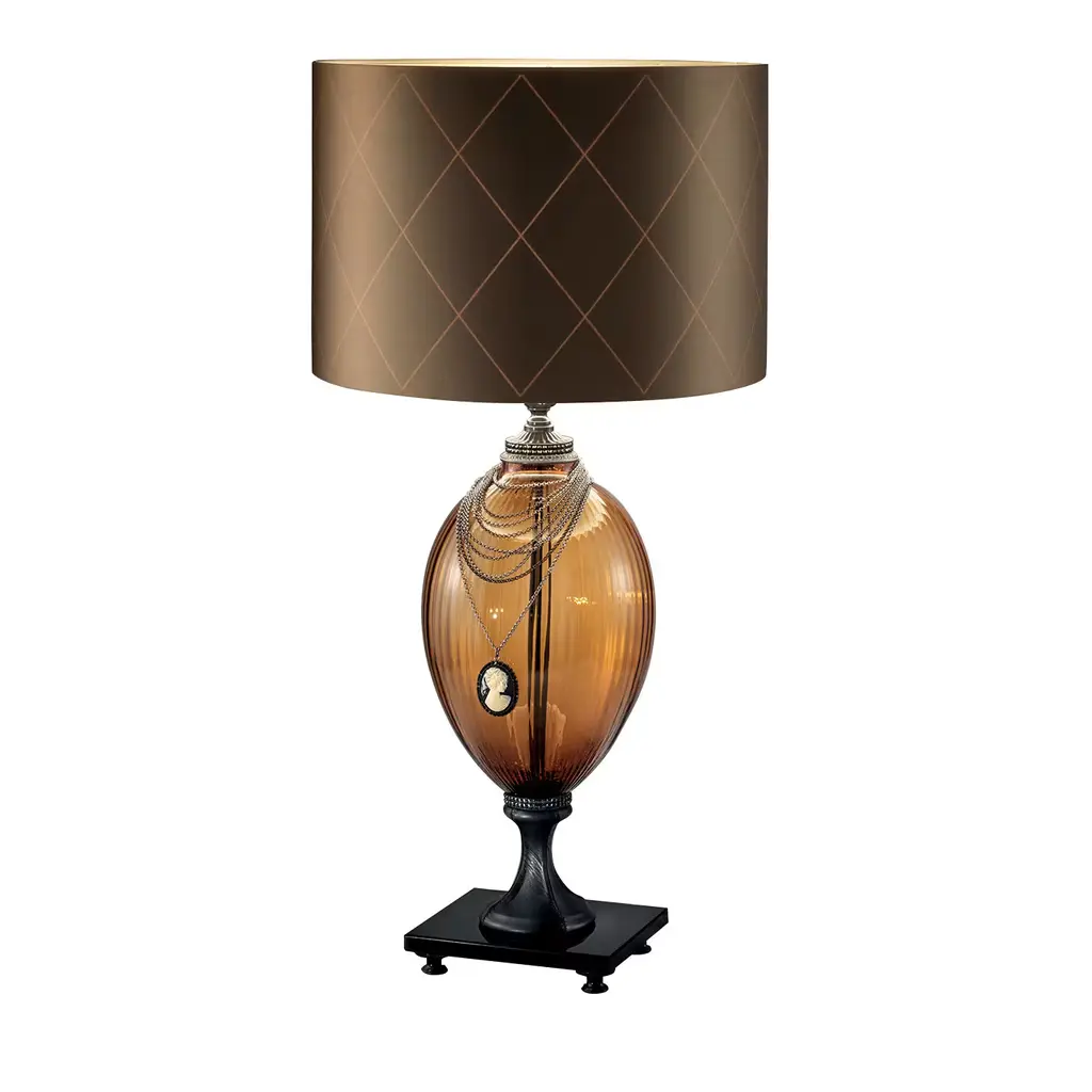 Blending timeless style with a vintage charm, this stunning lamp is a true masterpiece. This elegant lamp sports a silhouette with a ruby glass body and a dazzling 24kt gold-plated decorative necklace with cameo. The square marble base with black rhinestones is raised on four round stones and - together with the black leather element that supports the glass body - offer an interesting contrast with the gold fabric drum shade. The use of noble materials and the superb craftsmanship make this lamp a superb accent piece to be displayed anywhere in the house.