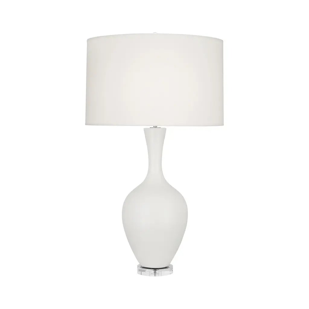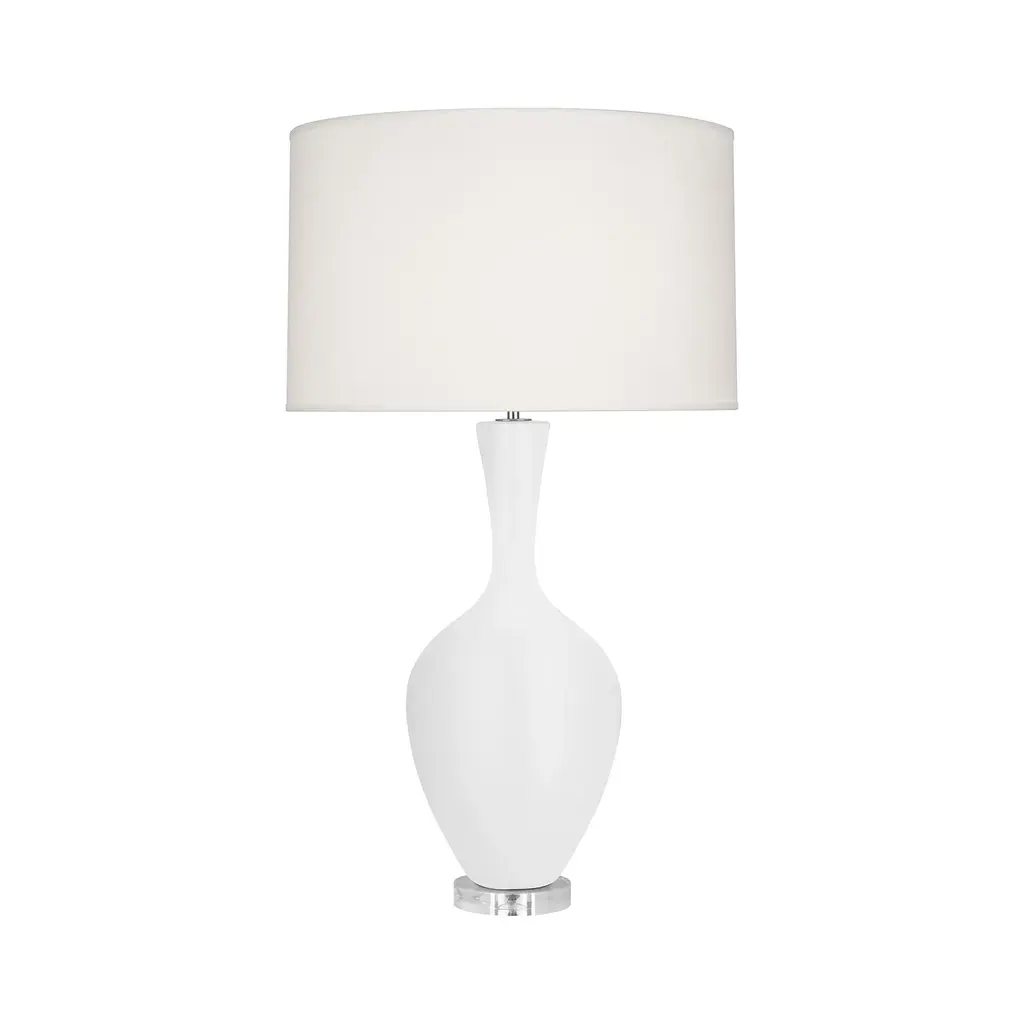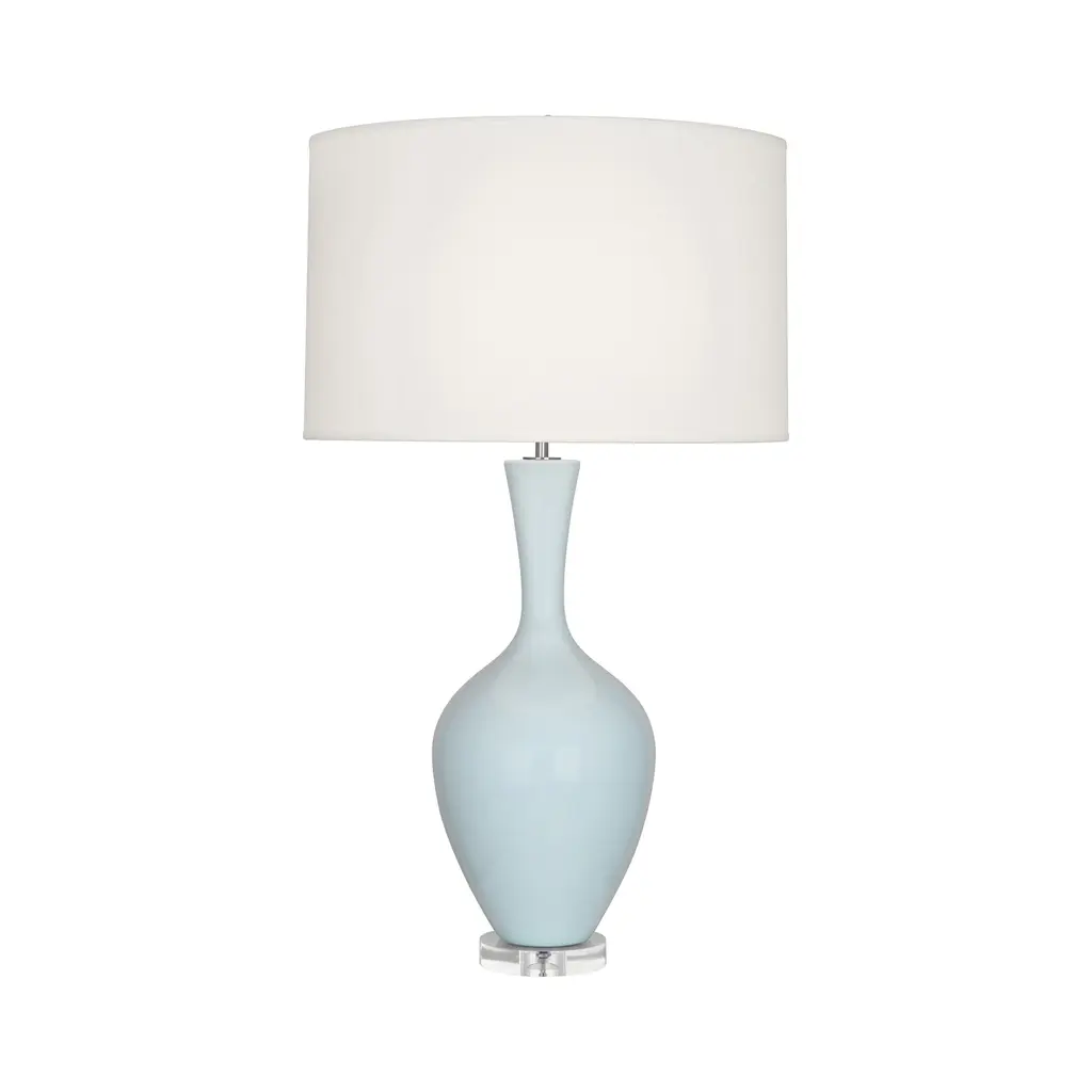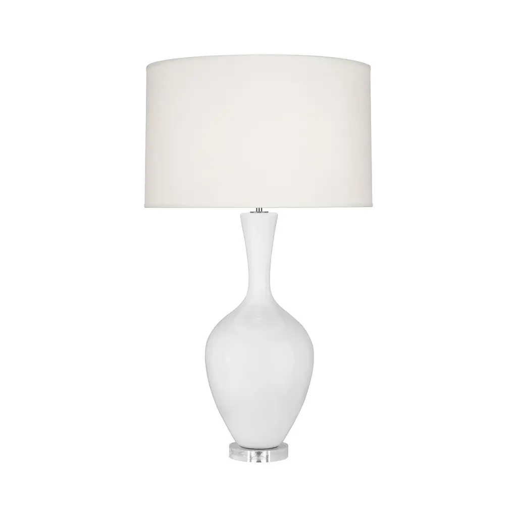 The Audrey Table Lamp from Robert Abbey combines elegant vase-like curves with premium materials, making it a sophisticated choice for modern side tables. Its clear Lucite disc base supports a glossy glazed ceramic body that gracefully tapers upward. The large pale Fondine fabric drum shade gently diffuses warm, inviting light, perfect for creating a cozy atmosphere. With a convenient hi-lo controller on the socket switch, you can easily adjust the brightness to suit your mood and setting. Highlights