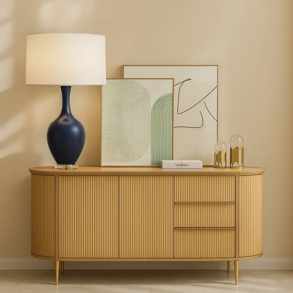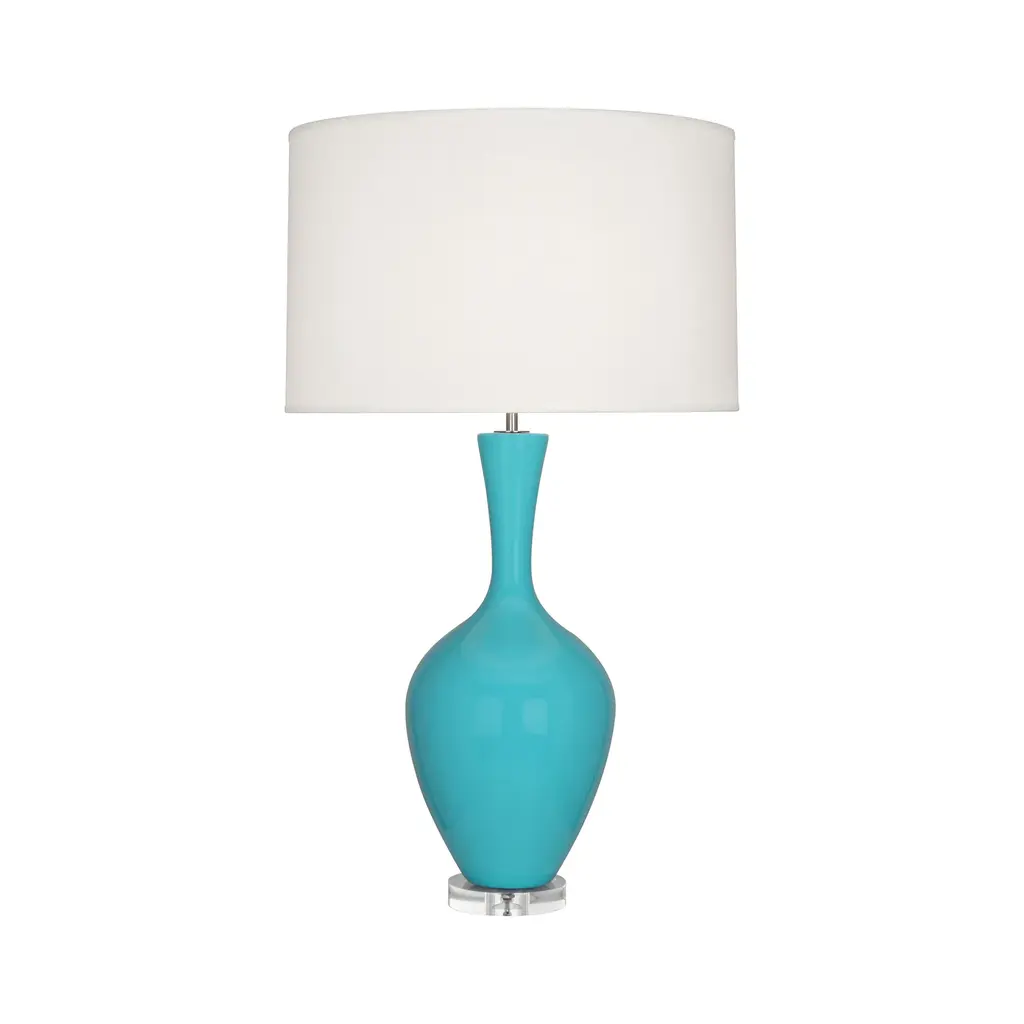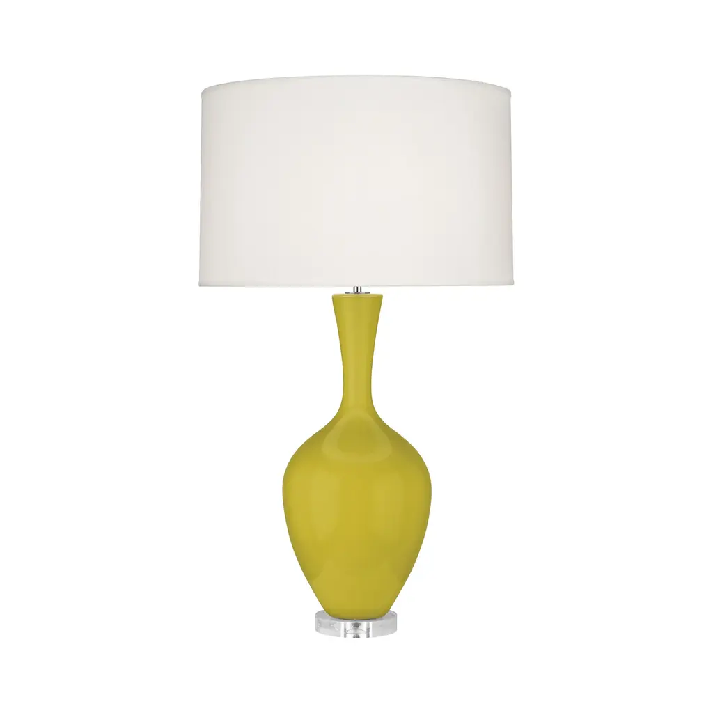 The Audrey Table Lamp from Robert Abbey combines elegant vase-like curves with premium materials, making it a sophisticated choice for modern side tables. Its clear Lucite disc base supports a glossy glazed ceramic body that gracefully tapers upward. The large pale Fondine fabric drum shade gently diffuses warm, inviting light, perfect for creating a cozy atmosphere. With a convenient hi-lo controller on the socket switch, you can easily adjust the brightness to suit your mood and setting. Highlights
