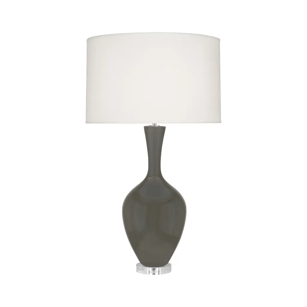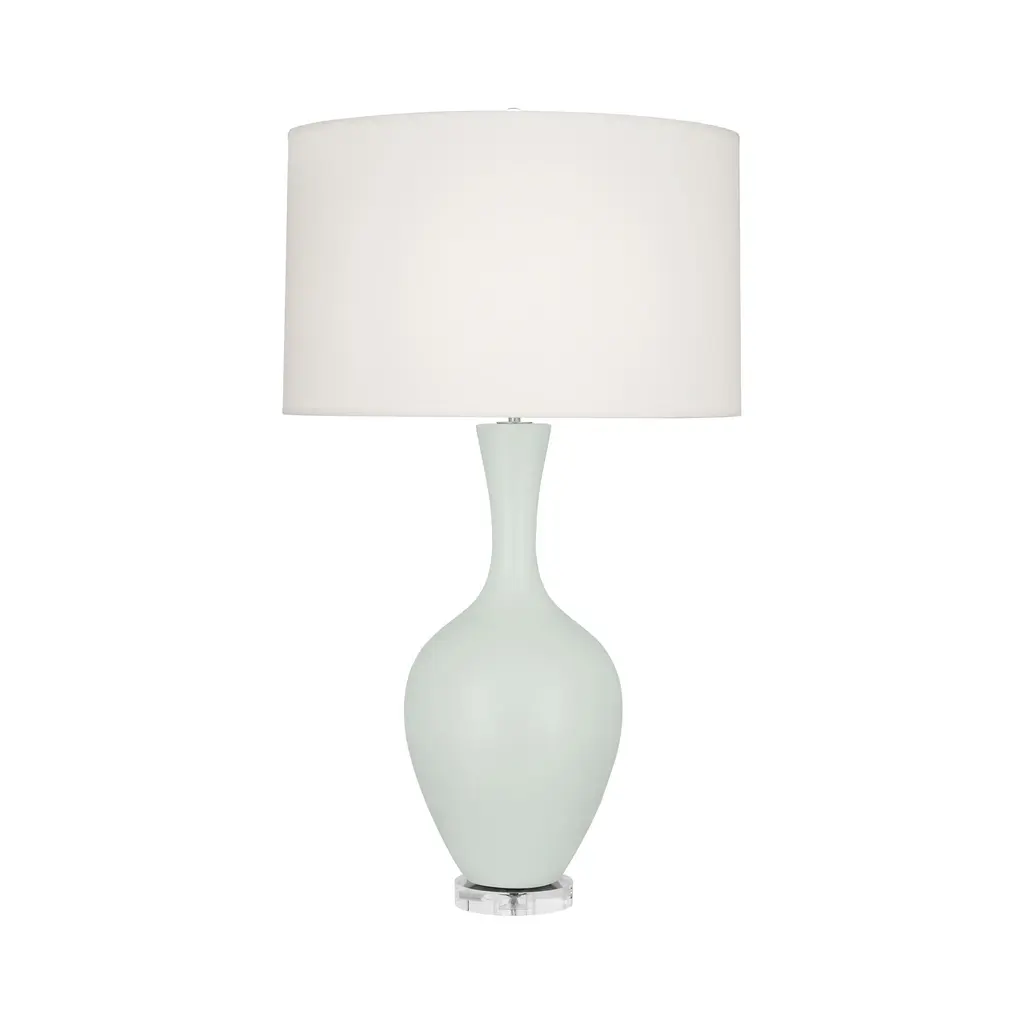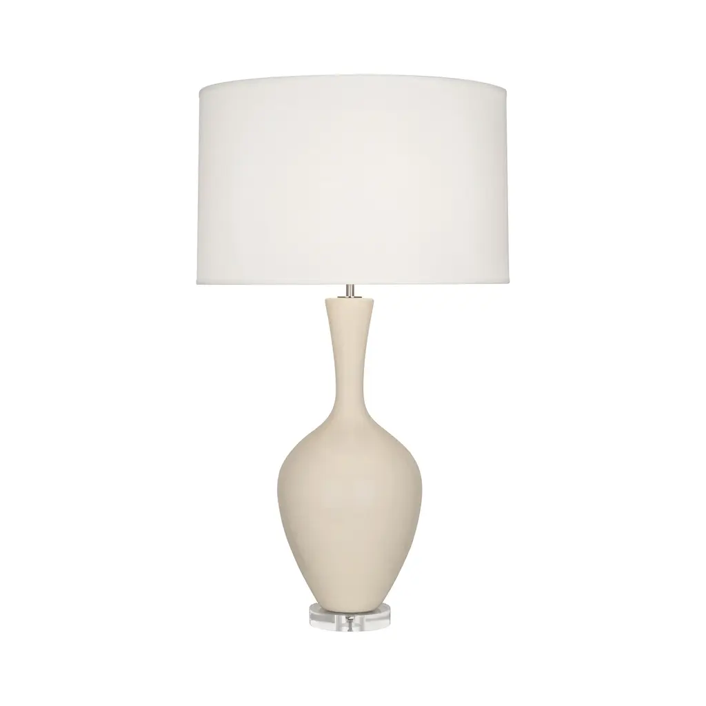 The Audrey Table Lamp from Robert Abbey combines elegant vase-like curves with premium materials, making it a sophisticated choice for modern side tables. Its clear Lucite disc base supports a glossy glazed ceramic body that gracefully tapers upward. The large pale Fondine fabric drum shade gently diffuses warm, inviting light, perfect for creating a cozy atmosphere. With a convenient hi-lo controller on the socket switch, you can easily adjust the brightness to suit your mood and setting. Highlights