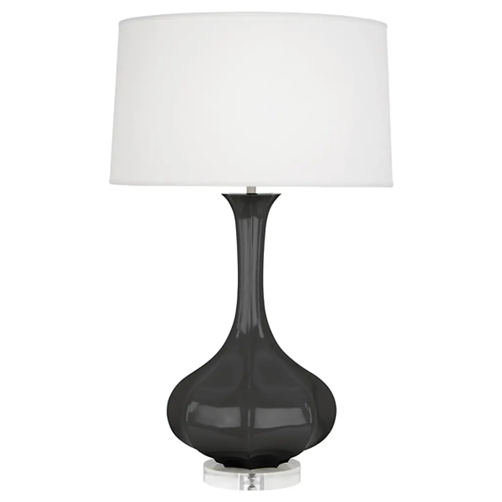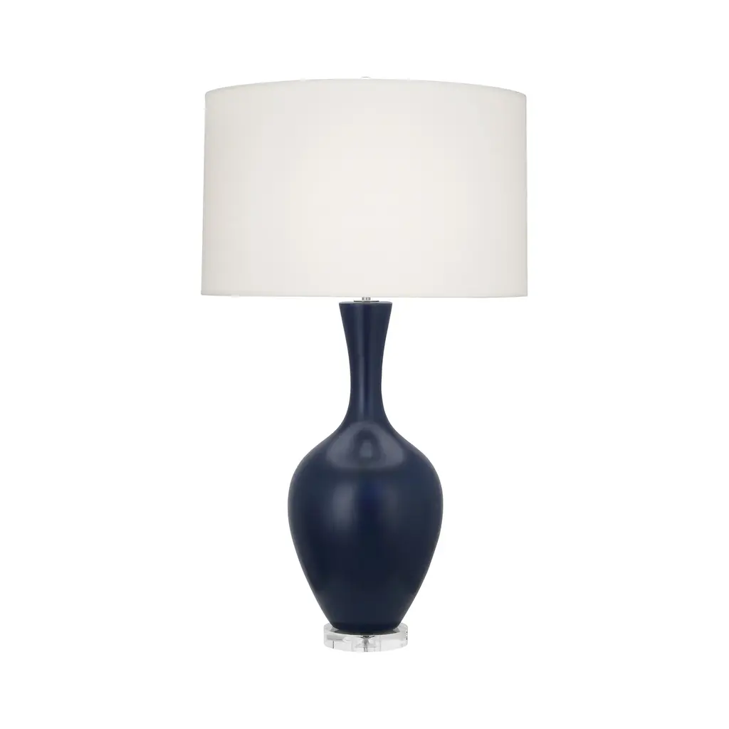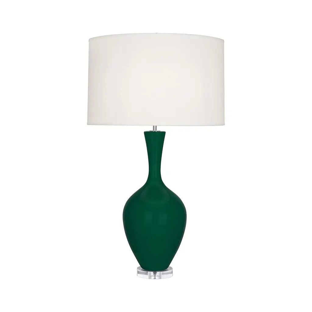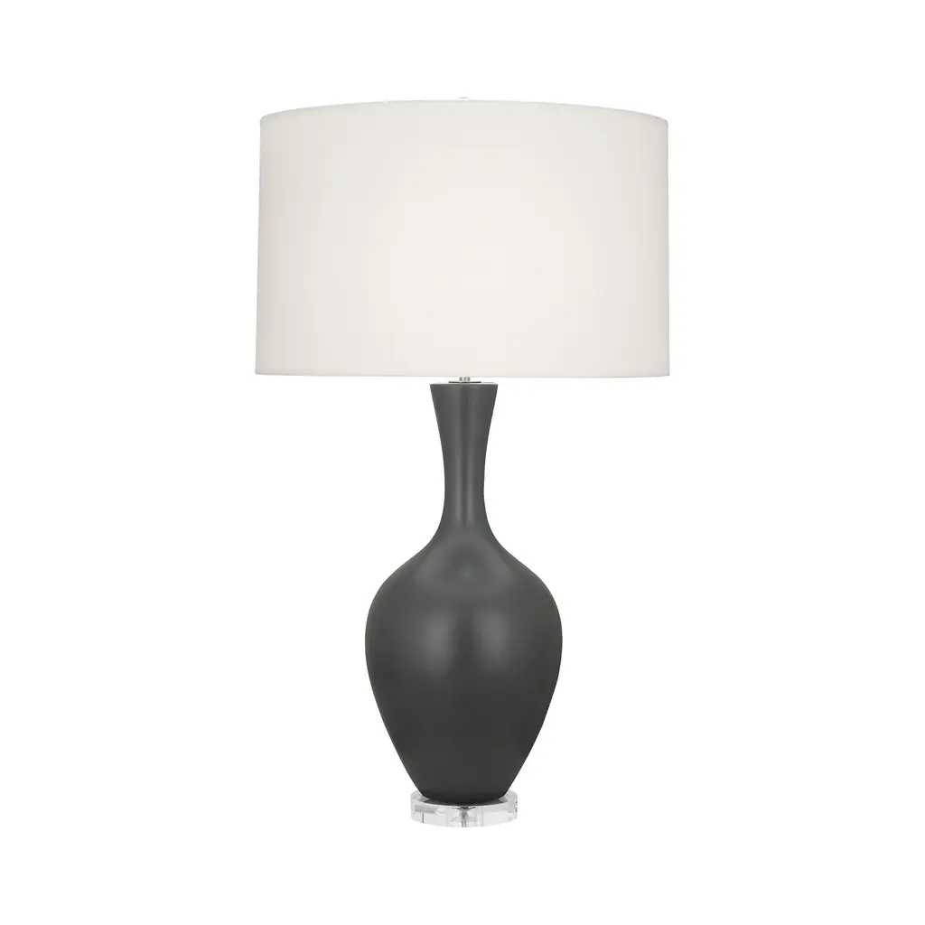 The Audrey Table Lamp from Robert Abbey combines elegant vase-like curves with premium materials, making it a sophisticated choice for modern side tables. Its clear Lucite disc base supports a glossy glazed ceramic body that gracefully tapers upward. The large pale Fondine fabric drum shade gently diffuses warm, inviting light, perfect for creating a cozy atmosphere. With a convenient hi-lo controller on the socket switch, you can easily adjust the brightness to suit your mood and setting. Highlights