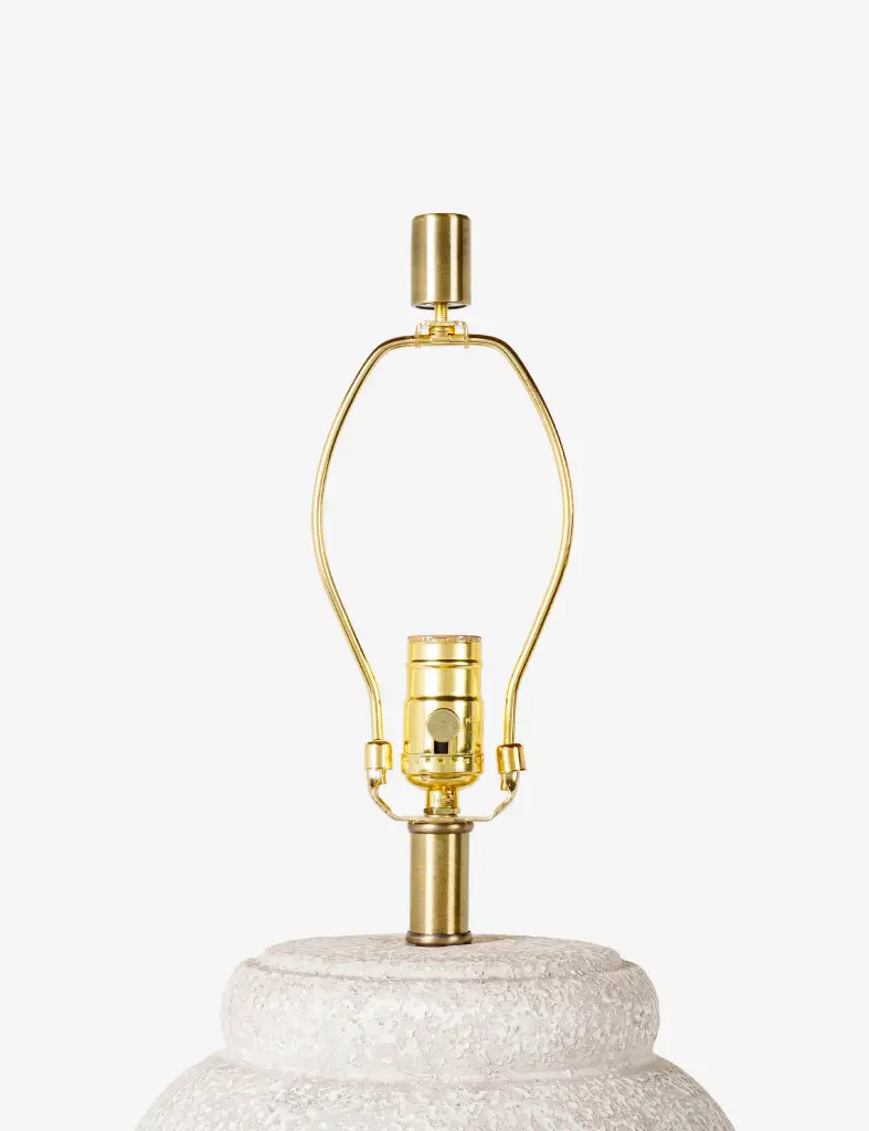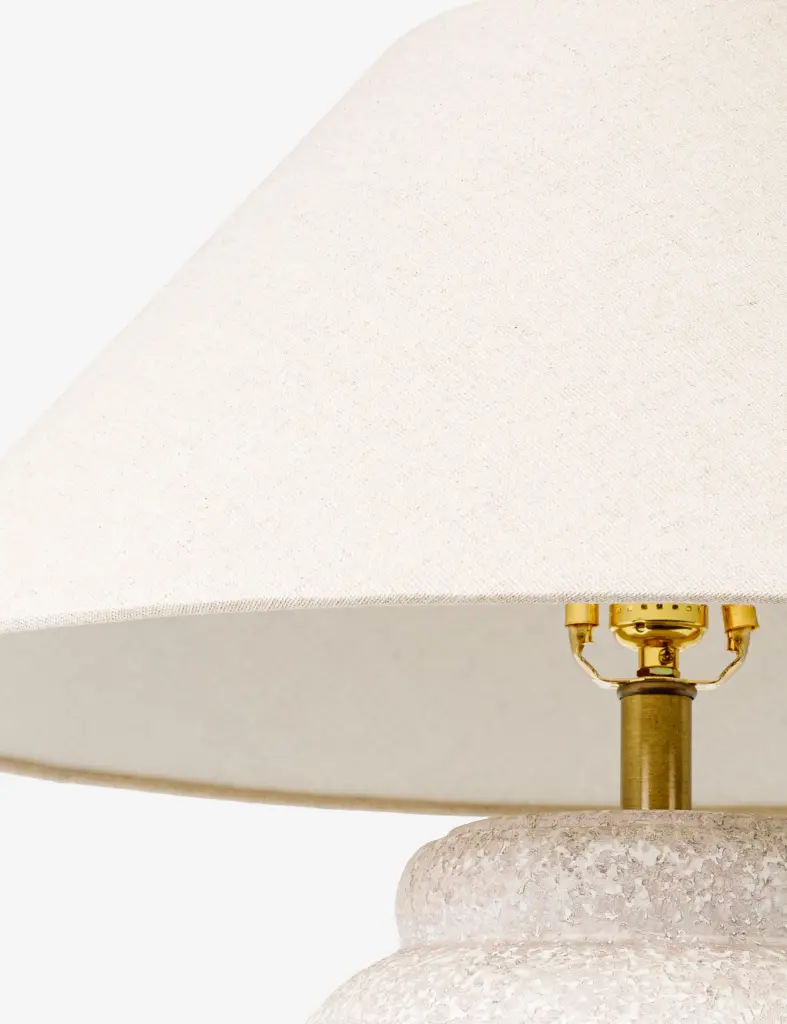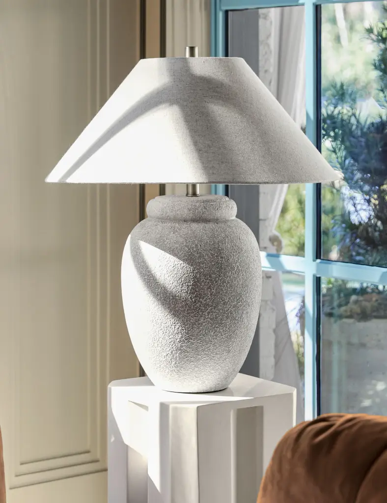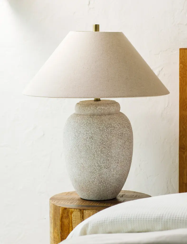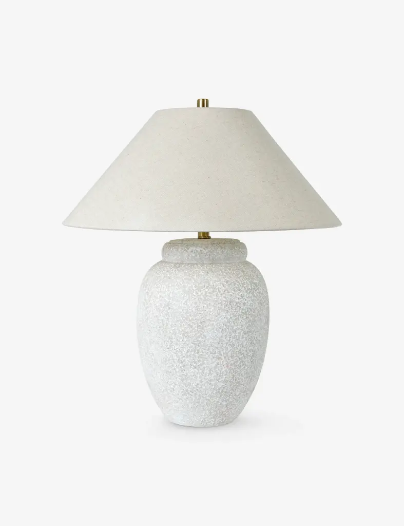 Whether curating a cottage feel or layering texture into transitional decor, the Audrina table lamp offers an elegant touch. Its classic design features a vessel-like body with a pitted surface clad in white. The lamp is topped with a beige linen shade that filters soft, warm light into the room.
