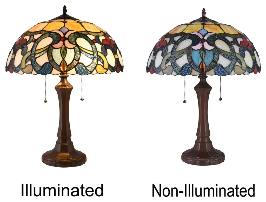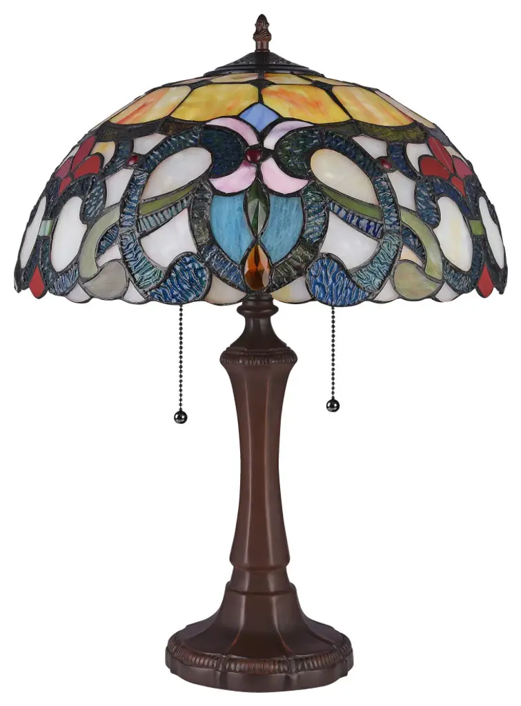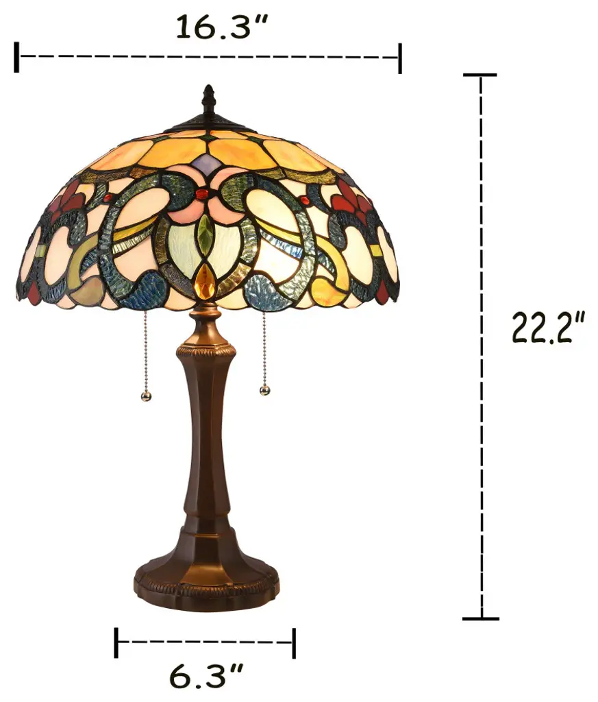 This is a very colorful design of a victorian style table lamp, featuring 2 pull chains, and a dark bronze finish base. This hand crafted piece is made up of over 280 pieces of hand cut, stained art glass, 9 glass beads and 6 crystals, each wrapped in a fine copper foil and soldered together to form each unique shade. It is created using the same technique developed by Louis Comfort Tiffany in the early 1900''s. Each panel is unique, and is sure to catch everyone''s eye with it''s gorgeous colors. Product Feature :- (2) 100 Watt max E26 Type A Bulbs (not included), Pull Chain Switch, 282pcs glass cut, 9 glass beads, 6 crystals, Downlight, Indoor Setting