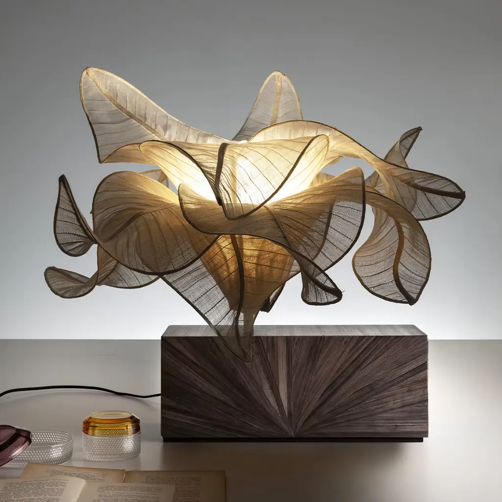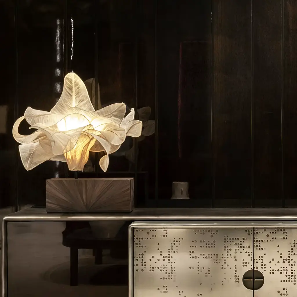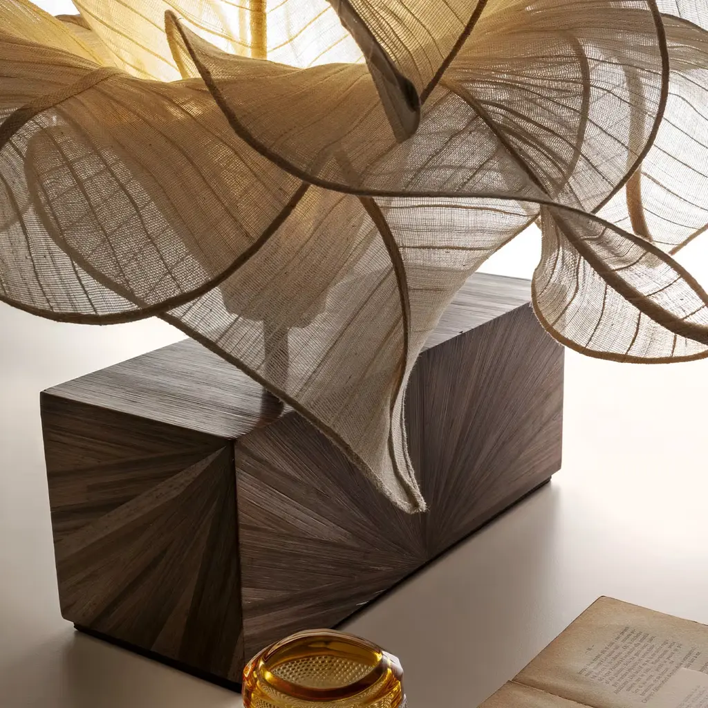 Laurameroni table lamps are veritable works of art. Their bases come in plain wood or are adorned with a rye straw inlay. The lampshades are available in decorative flower-shaped Banaca fiber or minimal parchment designs. They transform the perception of lighting into a warm and inviting atmosphere. Please, ask the Concierge service for further information.