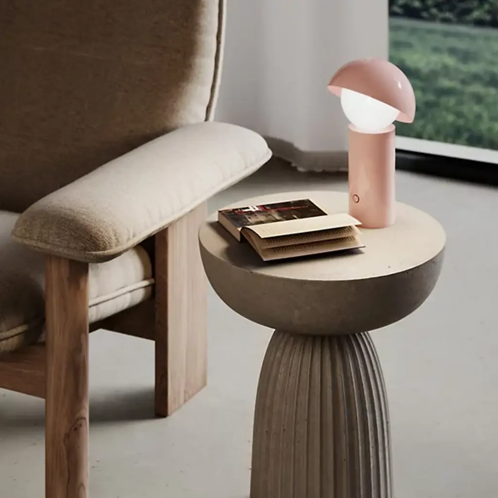 Aurora La Petite Rechargeable LED Table Lamp from Italamp crowns flat surfaces with a retro Italian presence that can go anywhere; its curved form and gentle, radiant light evokes the glow of an early dawn. Designed by Virginia Cei, it charges via a Micro-B cable port in its steel cylinder base, with a steel dome shade capping off a white glass globe diffuser, placed at a slight angle. The surface finish is inspired by early Italian design, reflecting light from within and mixing with the gentle ambient glow that passes through the diffuser.