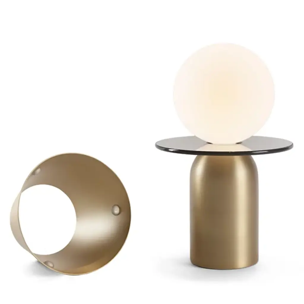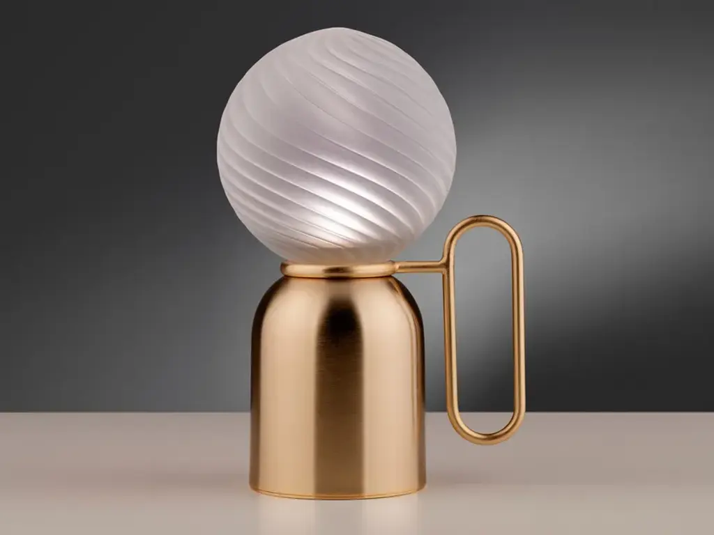The Aurora Table Lamp from Italamp channels Virginia Cei’s playful vision with a form that evokes the warm glow of a gorgeous dawn. Rising from a rounded base, its classic column body supports a tilted dome shade set above a white glass globe diffuser. Finished in rich metallic tones inspired by early Italian design, the dome reflects and redirects light. At the same time, the globe softens it, creating an interplay of ambient glow and subtle highlights across its layered structure.