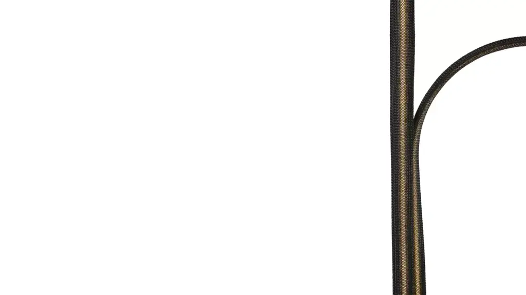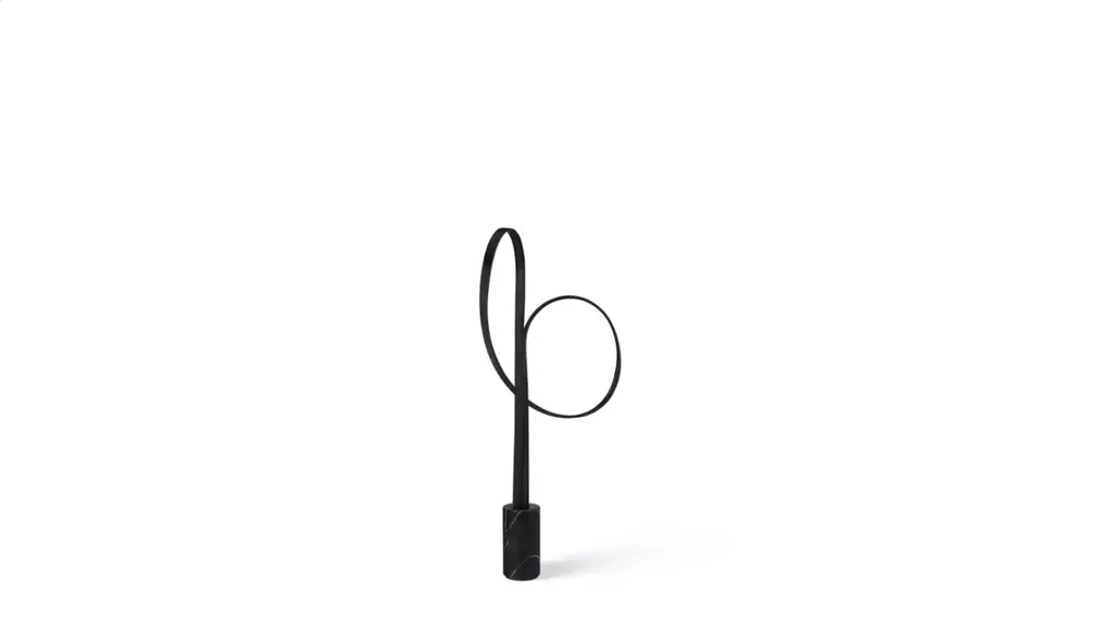 Table lamp with a hand-formed structure in matte black lacquered metal covered with a dotted polyester diffuser ribbon. Matte black marquina cylindrical base. LED strip.