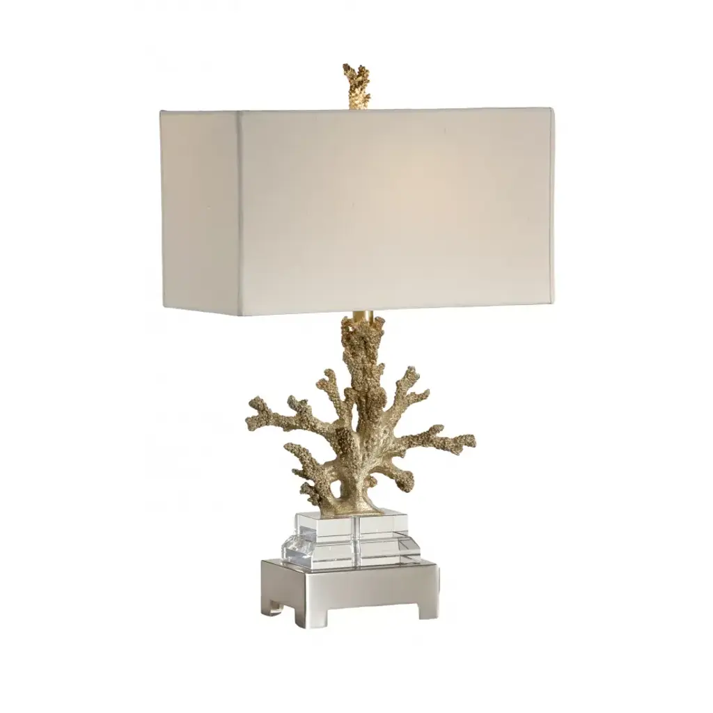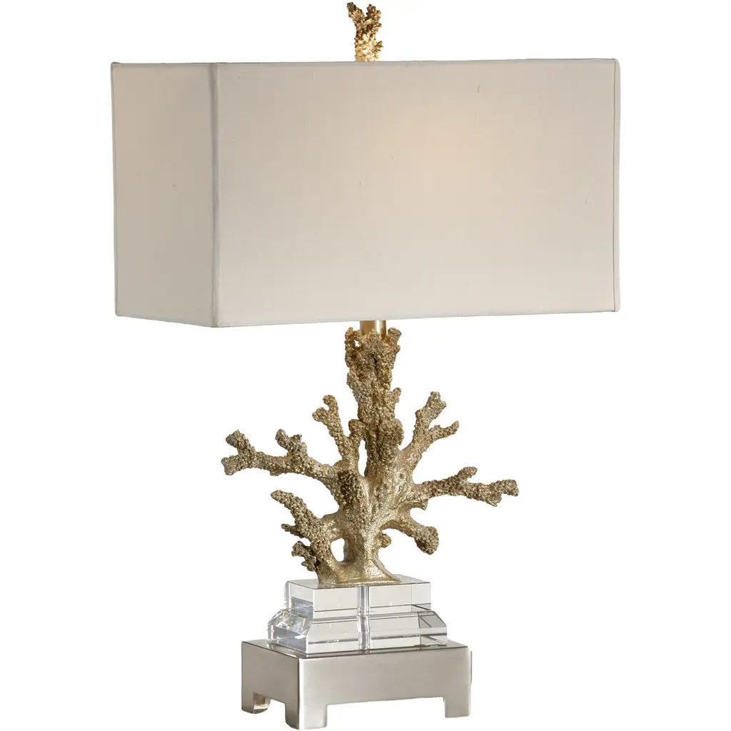 Glamorous, portable, & compact, a beautiful table lamp keeps your space illuminated in style. This accent light, the Autumnus lamp, is a branch shaped table lamp made of iron in a shimmering, gold finish. This luminary features an added touch in the form of a decorative crystal ball that nestles neatly into a pocket formed in the branch shaped base. Paired with a clean, white drum shade, this lamp is an excellent fit in any modern space!
