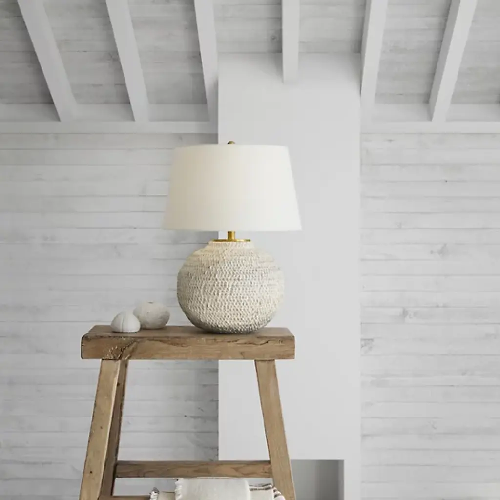 Presented by Visual Comfort Signature, the Avedon Table Lamp is designed by Marie Flanigan. The lamp's base features an intriguing composition of plaster and rattan, creating a delightful textural feast that dances along the orbed bodice. Perched atop the base is a lampshade that beautifully diffuses the illumination within, casting a soft and warm glow. Light dances the pattern along the base, creating a harmonious and visually pleasing effect. Avedon is a statement piece that combines texture, light, and artistry, adding sophistication and visual intrigue to your space.