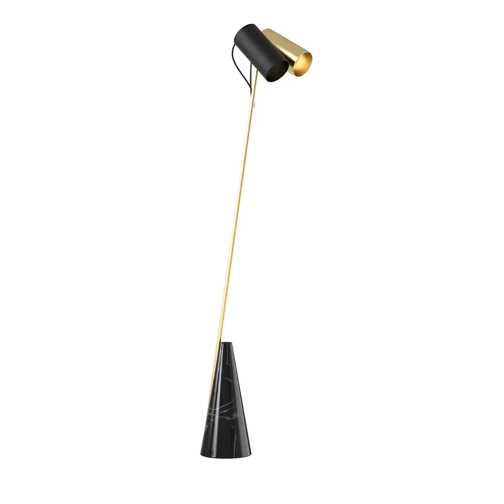 A sophisticated minimalist design made lively by a vivid color scheme defines this two-light table lamp. Fashioned of brass also with a satin finish, the streamlined frame is equipped with a straight arm that holds together two opposite-facing conical aluminum shades painted in black and blue, respectively. Please consult the Concierge for available color customization options.