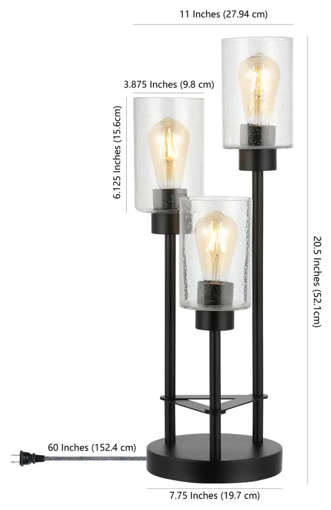 Upgrade your living room, home office, or bedroom with our farmhouse-inspired modern black lamp. Three clear seeded glass shades highlight the Edison-style LED bulbs. This minimalist desk, bedside or console lamps are the perfect solution for a vacation home or hospitality project.-This lamp''s transitional style is perfect for modern and rustic interiors, especially guest rooms and resort rentals-Quality touches include three seeded glass shades and an elegant silk-wrapped cord-Takes 1 bulb and compatible with 9W LED or 40W TYPE "A" or 13W CFL-Eco-friendly 4W LED bulb included-Fixture can be dimmable with a dimmable bulb (not included) and Electric Low Voltage dimmer (sold separately)-Color Temperature: 2700K-CRI: 80-Color: Black with clear shade-Body Material: Iron/Glass-Base Material: Iron-Includes: One (1) lamp-Assembly Required-Lamp: 20.5 inches high x 11 inches wide x 11 inches deep-Shade: 6.13 inches high x 3.88 inches wide x 3.88 inches deepYou see a lamp.We see a decorative work of art.A perfectly curved shade casts a dramatic shadow on a floor. A silk cord you never want to hide. Compatible with LED lightbulbs: as easy on the environment as they are on the eyes. The JONATHAN Y Lighting collection considers every detail from impeccably sourced materials to designer styling. And our prices are so attractive, we''ve transformed a functional necessity into a fashion accessory.JONATHAN Y Lighting - a fashion revolution in home decor.