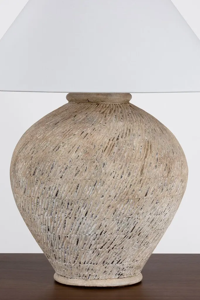 A textural delight, this table lamp features a tactile ceramic base with an etched treatment across its naturally porous surface. The unique base allows light and shadow to play within the grooves, creating a visually dynamic statement piece. A white linen shade tops the lamp, adding a classic, fresh note to balance the earthy base.
