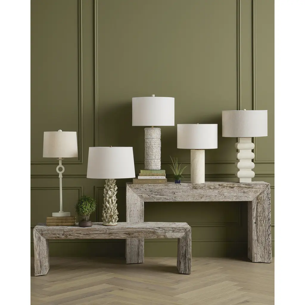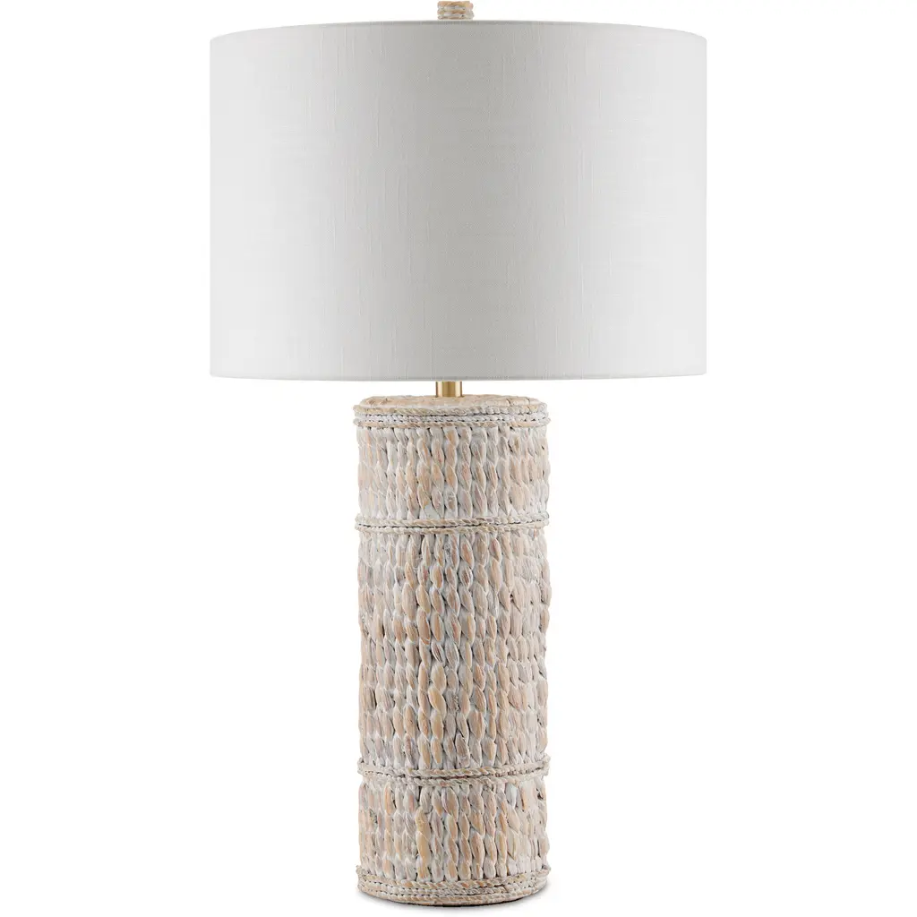 The Azores White Table Lamp has a body covered in woven water hyacinth that has a light white wash over the natural material. This is one of our sustainably inspired offerings because the plant grows naturally in Vietnam in the streams, and people harvest it to make baskets. Because it grows wild and voraciously, removing the plants keeps the streams from clogging. Design details of note are how the water hyacinth is woven in different directions and the matching finial. We also offer this lamp in natural.