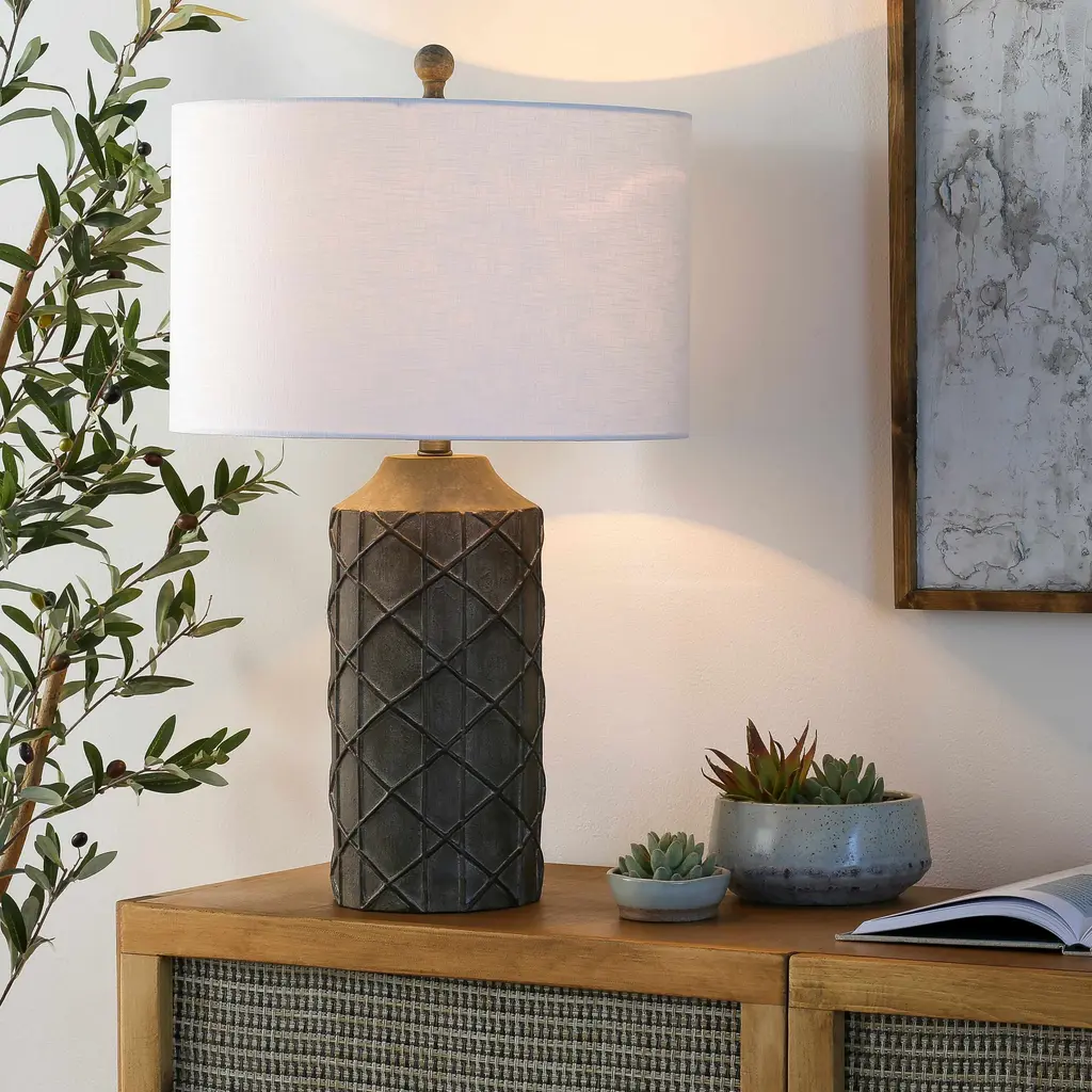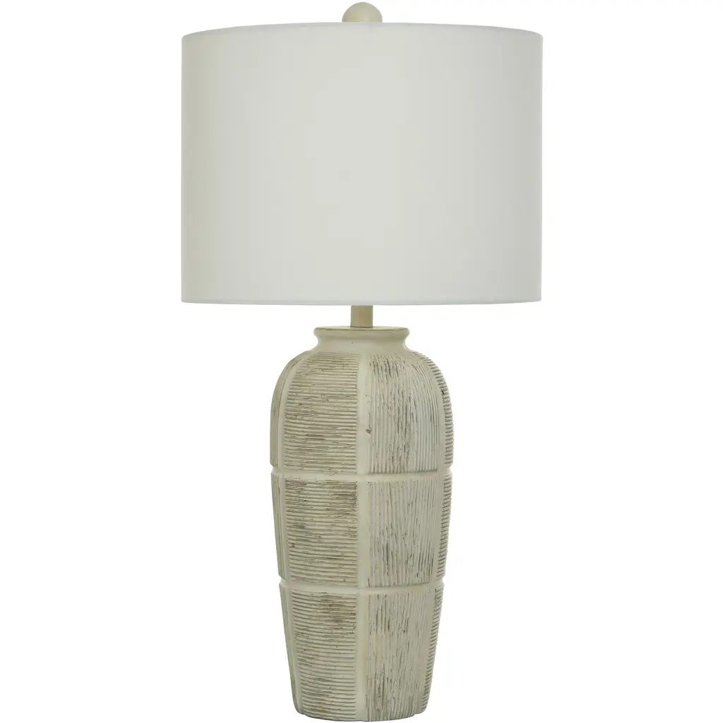 Collection: Bacabac Colors: Camel, Metallic - Nickel Material: Body: Resin,Shade (Outside): Linen Styles: Traditional Made In: China Lighting Type: Accent Table Lighting Base: Resin Base Color: Taupe Shade Material: Linen Shade Color: Ivory Cord Length: 6' Switch Type: 3-Way Number of Bulbs: 1 Socket Type: E-26 Bulb Wattage: 100W