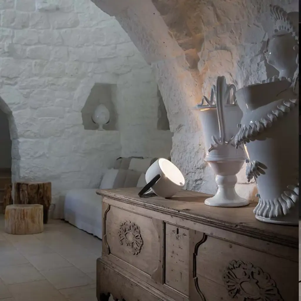 A feminine and irresistible design. The Bag Table Lamp from Karman has a simple appearance that adds contemporary style to whatever room it’s in. It was designed by Baldessari and Baldessari, and it has a soft and welcoming cover and a “handle” that props it up to adequately light your space. It is made from ceramic—although the “handle” is made of metal—and it has a plexiglass diffuser that evenly spreads light around your living room or office.