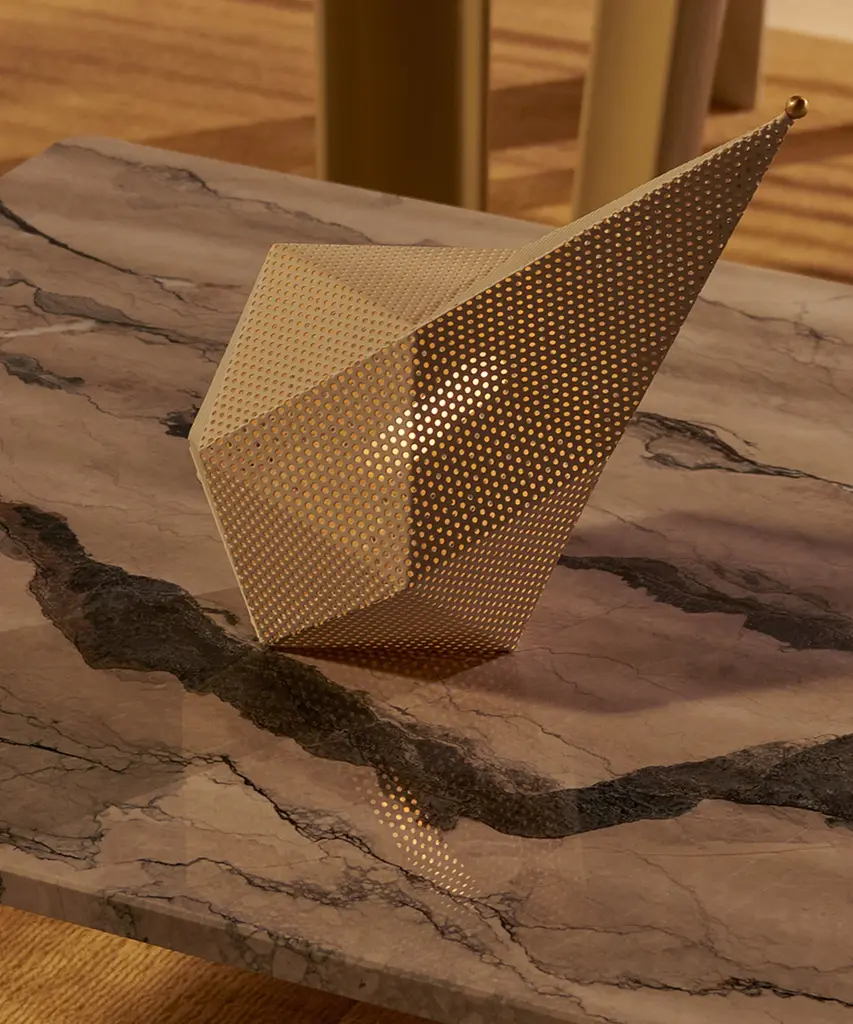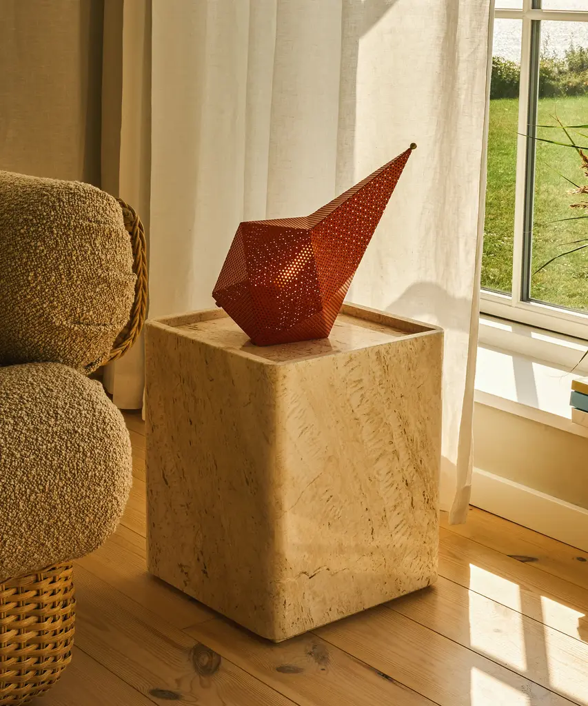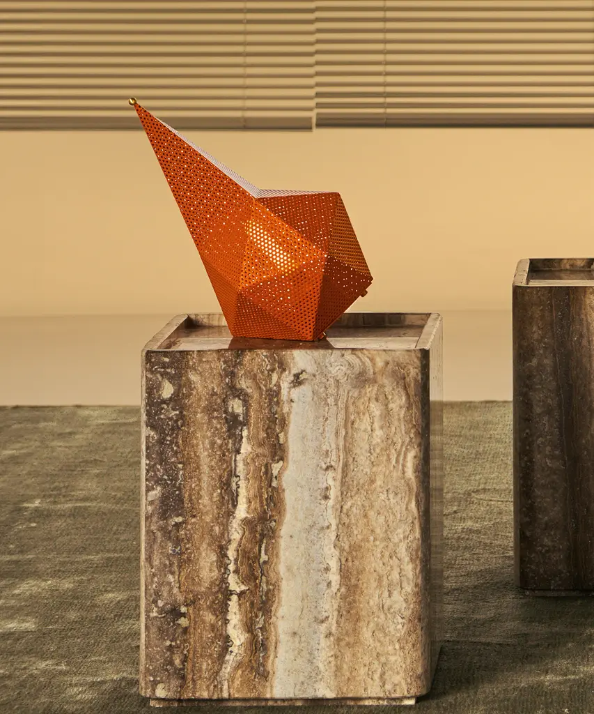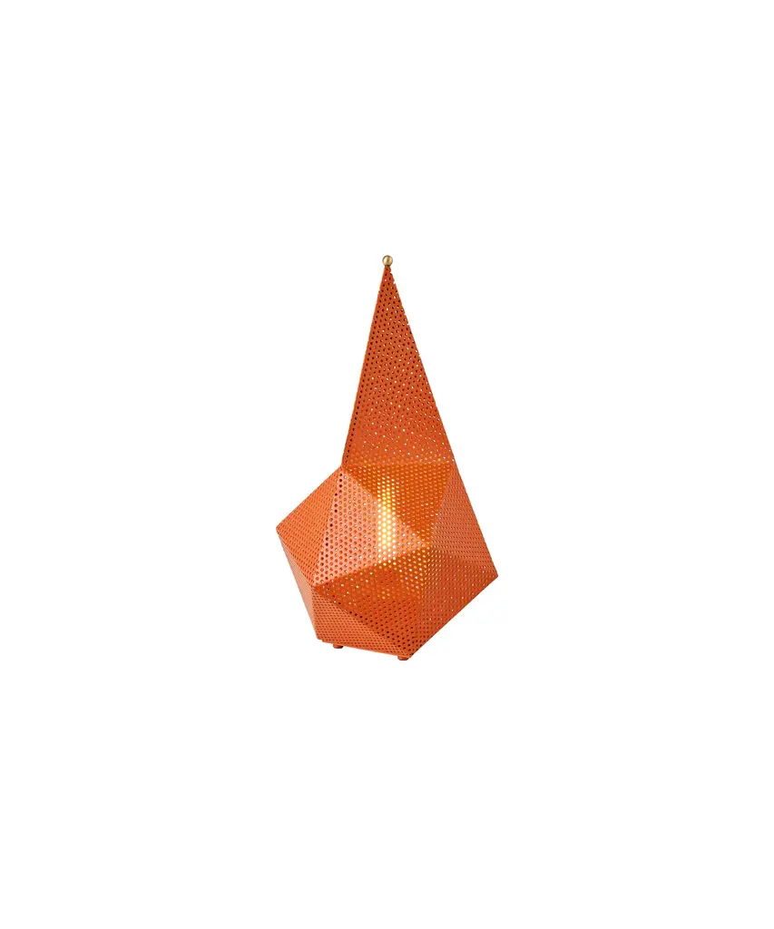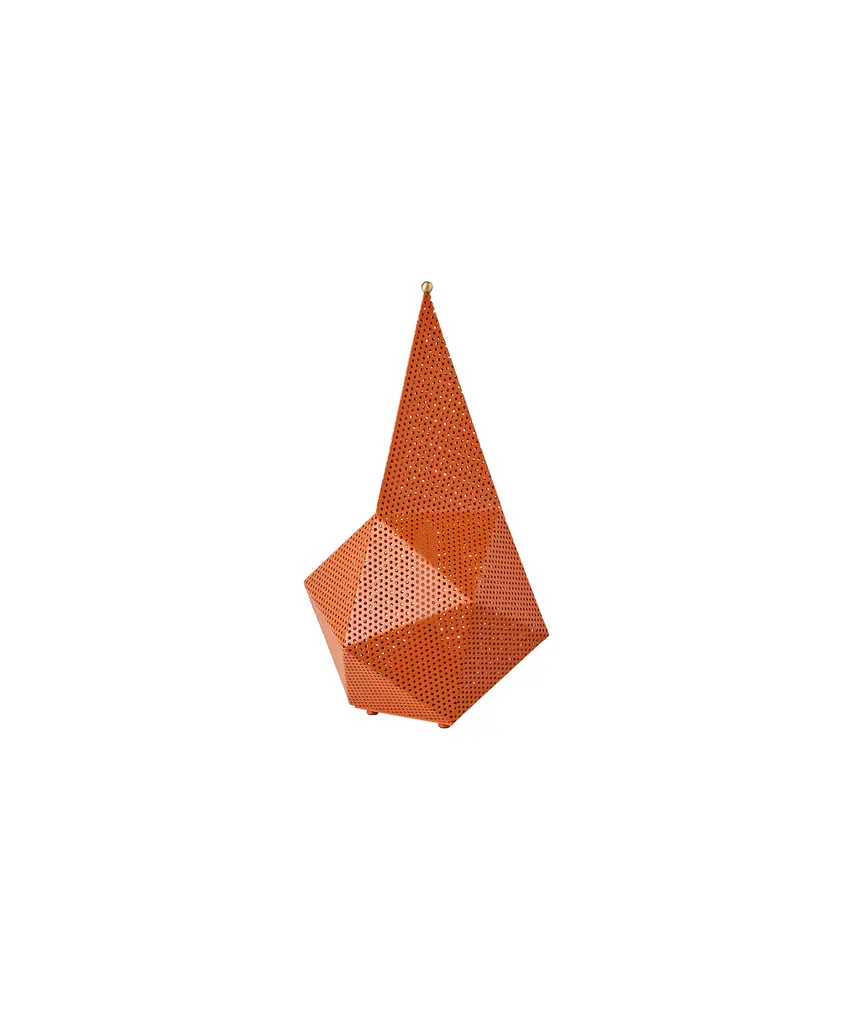 Originally designed in 1954, the Bagdad Lamp is a brilliantly offbeat showcase of Mathieu Matégot’s material affinity with perforated metal. A multifaceted, cubist construction with a comet-like tail, the Bagdad’s sculptural design has proven timeless in its playful uniqueness. The new edition scales down the size by half and adds a further element of versatility by making it portable. Fitted with a touch-activated dimmer with three levels of brightness, and available in three colors – Black, White, and International Orange – the Bagdad represents a unique addition to GUBI’s Matégot portfolio, and the ever-growing collection of rechargeable lamps without limits. Produced by Danish design publisher, Gubi.