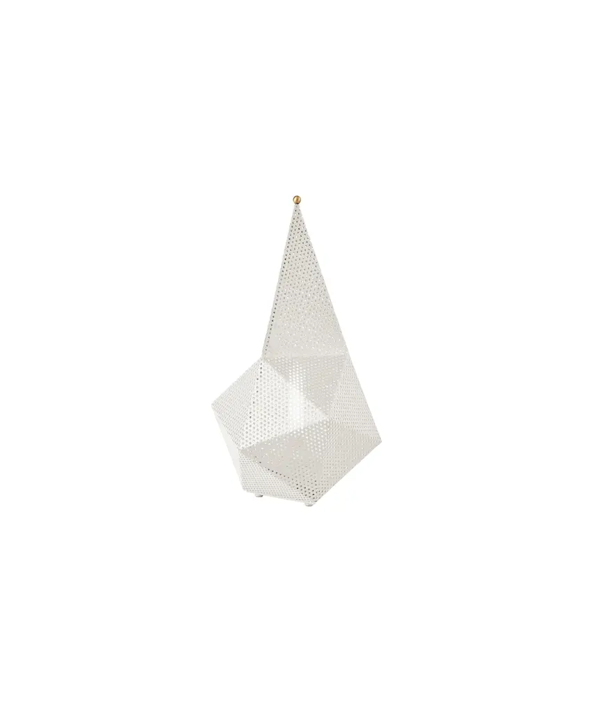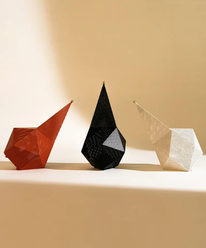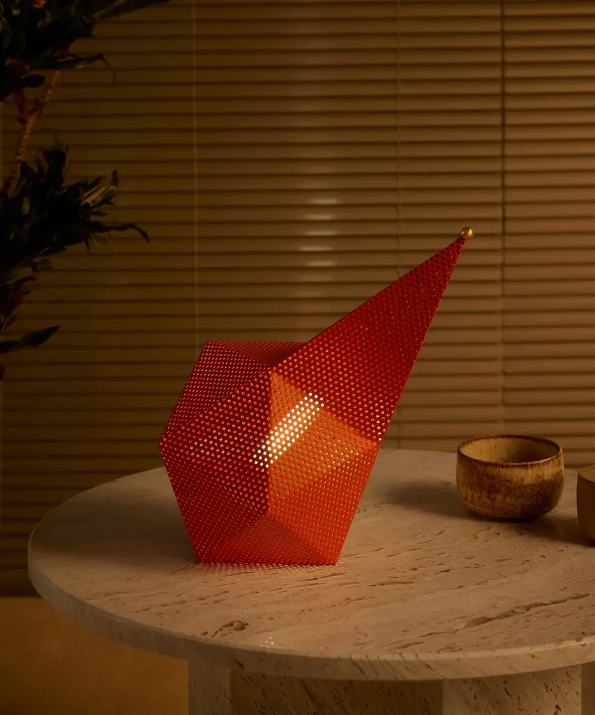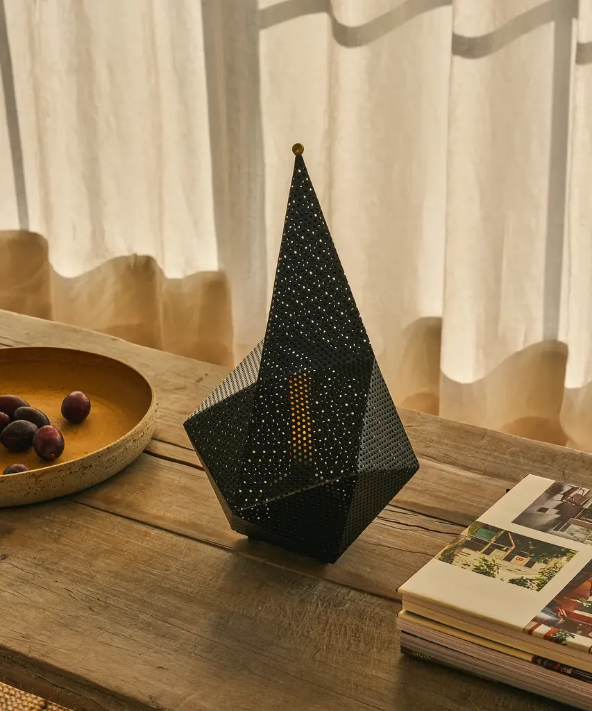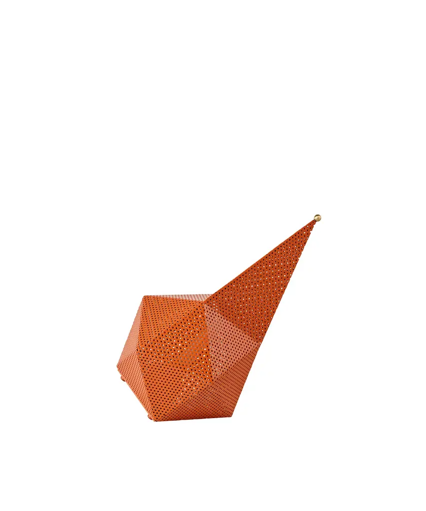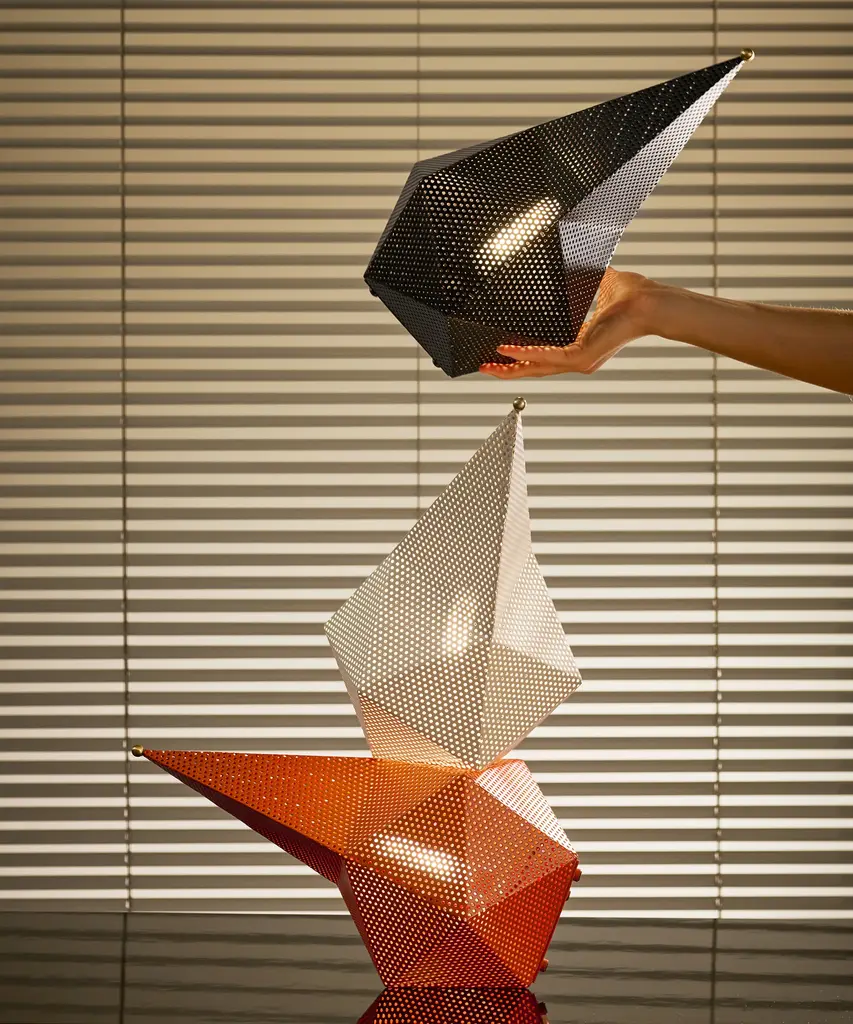 Originally designed in 1954, the Bagdad Lamp is a brilliantly offbeat showcase of Mathieu Matégot’s material affinity with perforated metal. A multifaceted, cubist construction with a comet-like tail, the Bagdad’s sculptural design has proven timeless in its playful uniqueness. The new edition scales down the size by half and adds a further element of versatility by making it portable. Fitted with a touch-activated dimmer with three levels of brightness, and available in three colors – Black, White, and International Orange – the Bagdad represents a unique addition to GUBI’s Matégot portfolio, and the ever-growing collection of rechargeable lamps without limits. Produced by Danish design publisher, Gubi.