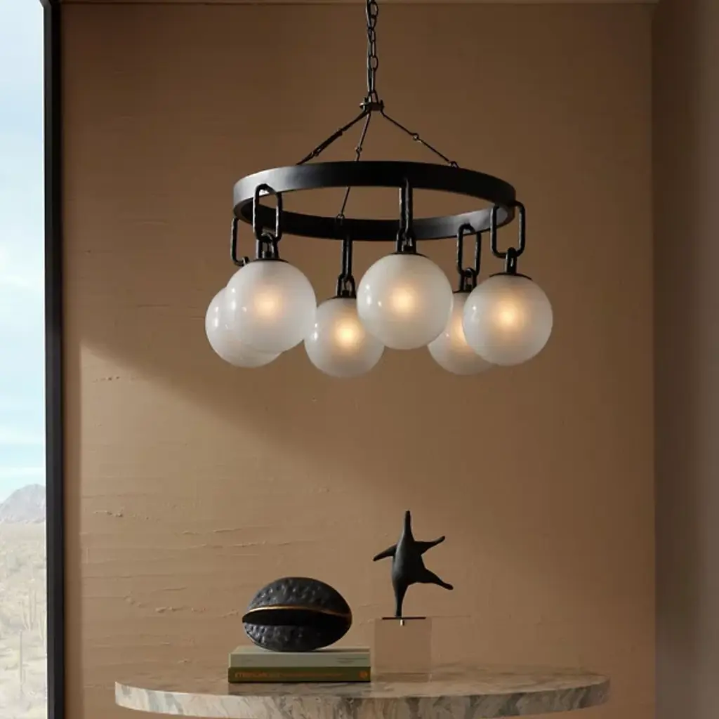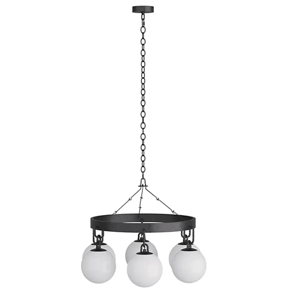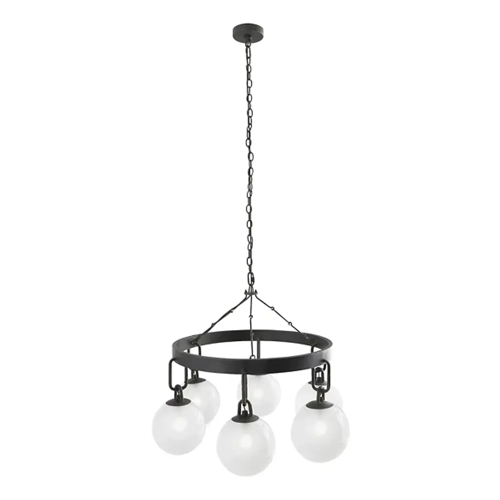 The Bailey Chandelier from Arteriors makes a bold statement in high-ceilinged spaces. It descends from a circular canopy via a single length of chain and transmits small fittings to a horizontal hoop, utilizing larger chains to suspend the lamping equidistantly beneath. Six frosted glass globes gracefully suspended from the substantial iron ring plated in bronze. The fixture's understated, vintage design is enhanced by oversized chain details, adding an old-world note. The fixture is damp-rated for versatile deployment and incorporates Transitional and mid-century modern styles, dispatching a generous glow with understated elegance.