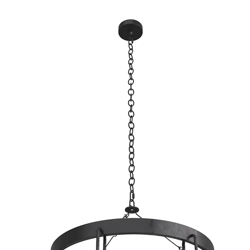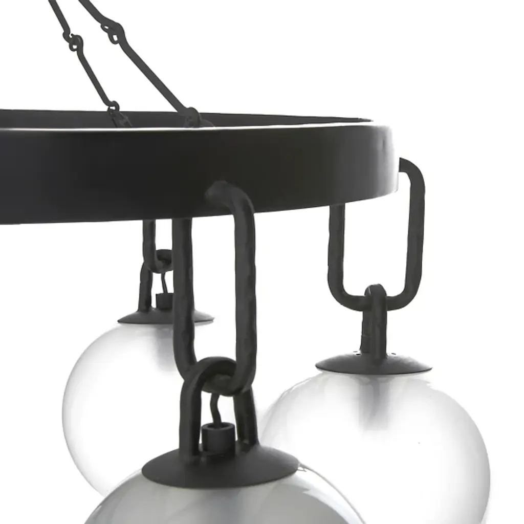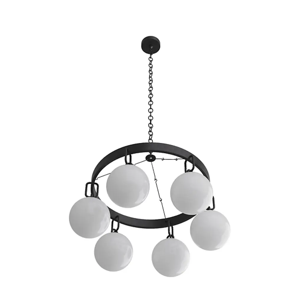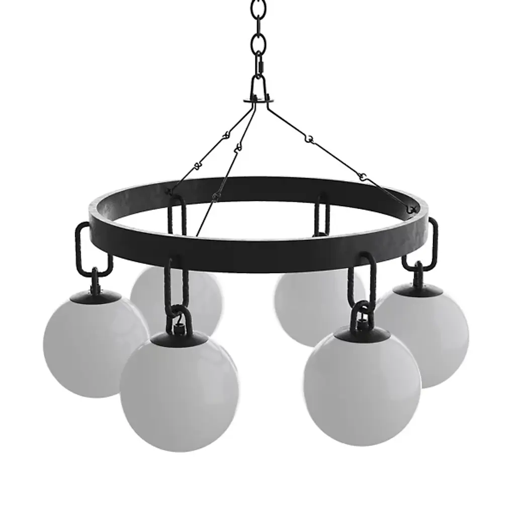The Bailey Chandelier from Arteriors makes a bold statement in high-ceilinged spaces. It descends from a circular canopy via a single length of chain and transmits small fittings to a horizontal hoop, utilizing larger chains to suspend the lamping equidistantly beneath. Six frosted glass globes gracefully suspended from the substantial iron ring plated in bronze. The fixture's understated, vintage design is enhanced by oversized chain details, adding an old-world note. The fixture is damp-rated for versatile deployment and incorporates Transitional and mid-century modern styles, dispatching a generous glow with understated elegance.