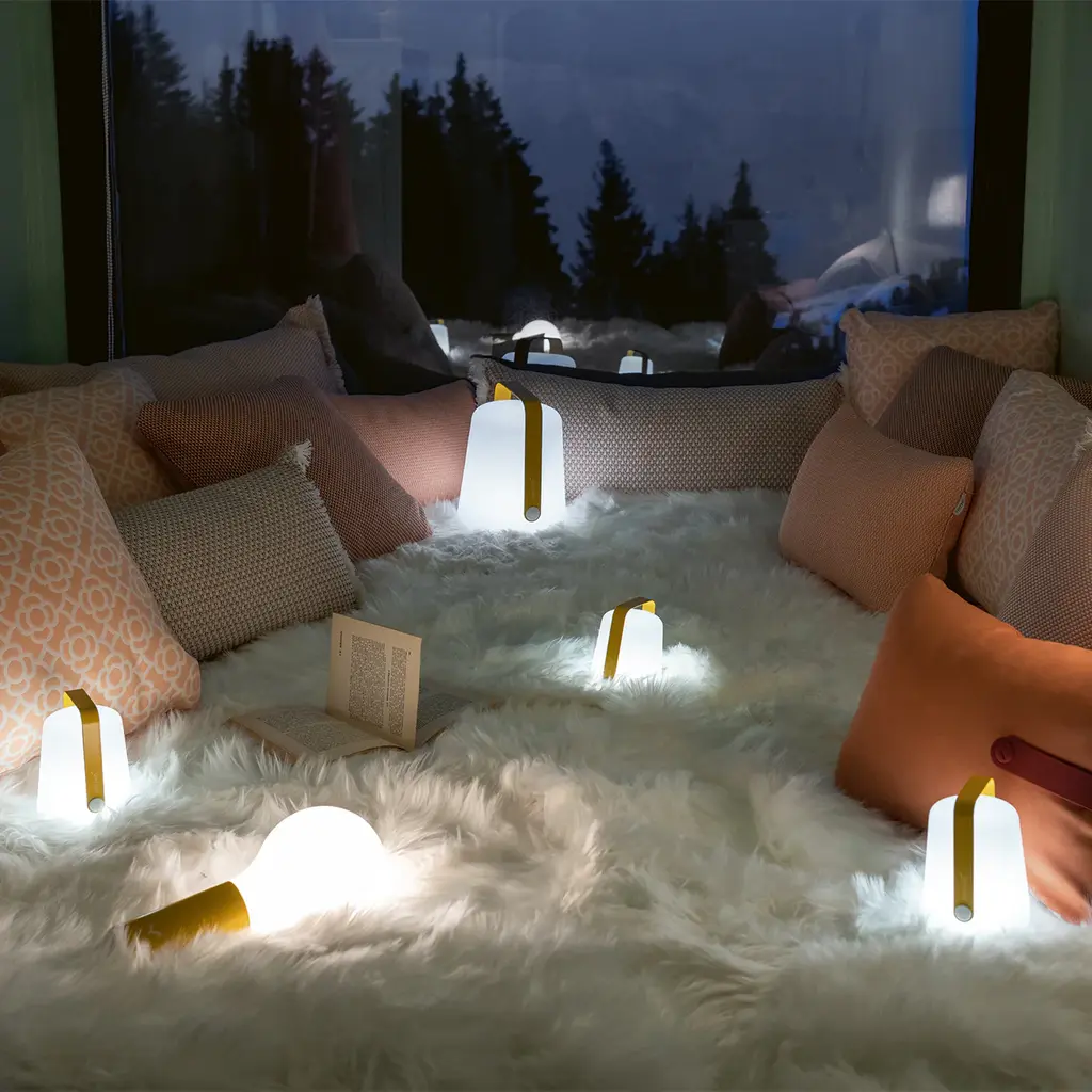A portable design ready to go anywhere, the Balad Lamp from Fermob offers a streamlined silhouette and colorful carrying handle to illuminate any spot. Providing softly diffused light to brighten up bedside tables, living room seating areas, and covered patio dining tables, this portable lamp offers a gradual increase in lighting intensity to adjust to the ambiance of your space. Easily recharged with a USB cable, this lamp can truly go anywhere.Highlights