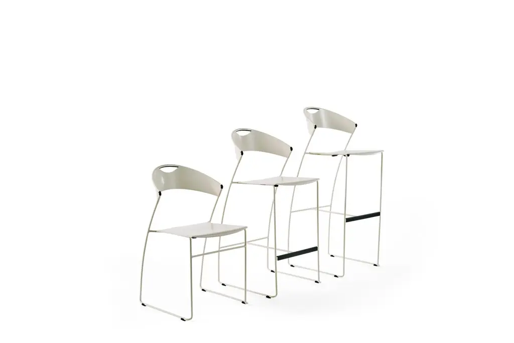 Out of the frenetic turmoil of Wettstein's design activity, one day emerged the idea of a chair; defying all known logic, the structure of the back, curved forwards. With this idea as basic condition of the design, form was translated into function. During the revision of the project for industrial production, the back also became an arm and the chair was transformed into a small armchair. This "supersleek" creation, seemingly made out of air and a clever idea, is surprisingly comfortable.Seating system with steel rod structure painted with epoxy powders. Seat and seatback in molded sheet metal painted to match the structure.Born in 1958 in Ascona, Switzerland, he lived and worked in Zurich. His main professional activities were in the fields of product design and interior architecture. He designed fashion and furniture showrooms, public spaces, hotels, installations, offices, both in Switzerland and abroad. He designed limited edition collections of furnishings and accessories for several Swiss companies. His projects include furniture, lamps, watches, eyeglasses, rugs, handles, bikes. His collaboration with Baleri Italia began in 1985; he designed several many successful products for the company. Hannes Wettstein died in July 2008. only 50 years old.