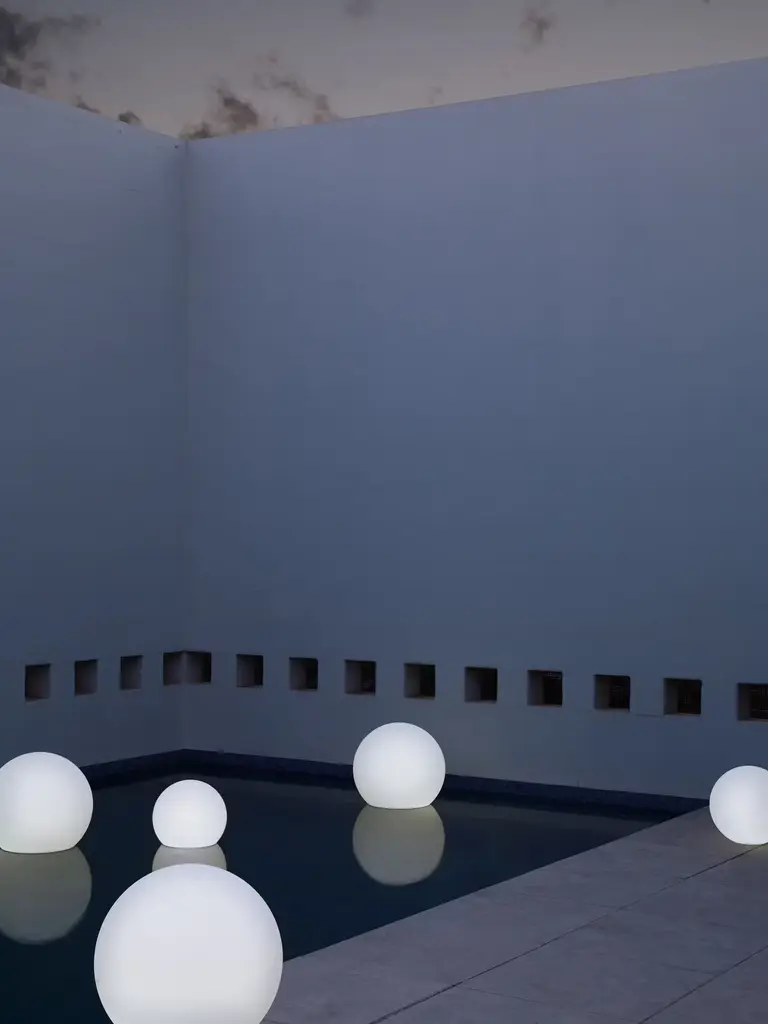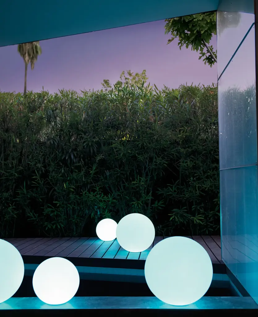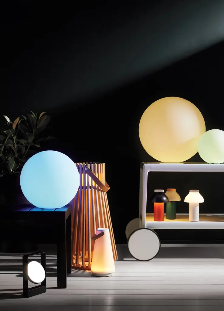 Waterproof, shockproof, cordless, and rechargeable, the Ball Portable LED Lamp (2009) redefines how we think about light. Suited for use practically anywhere, it has three modes to choose from: static in one of four colors, dynamic with unlimited colors changing automatically, and candle effect. A full charge provides up to 8 hours at maximum intensity and 12 hours at low intensity. Bulbs (included): 16 white LEDs, 36 color LEDs. Bluetooth technology allows easy app-based control via smartphone. Made in China.