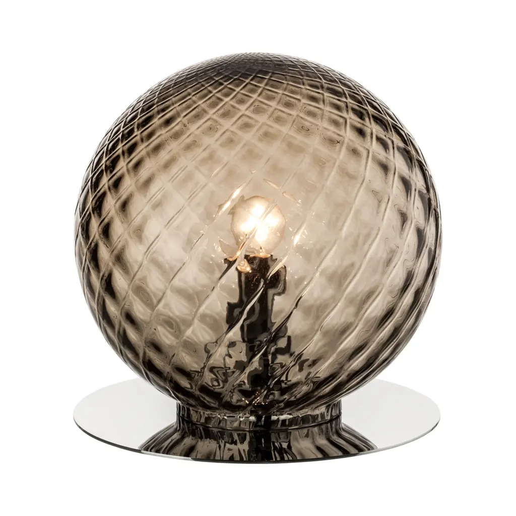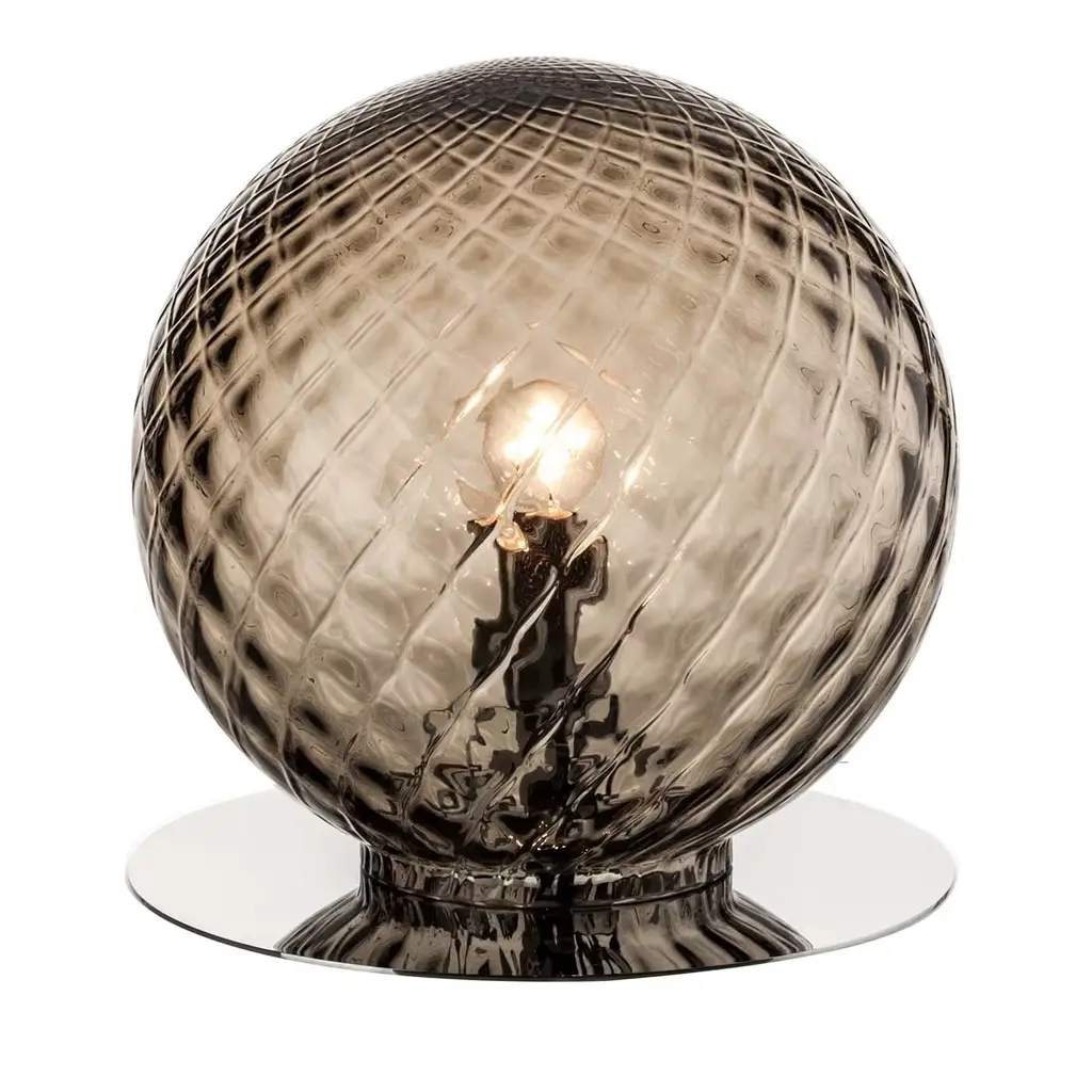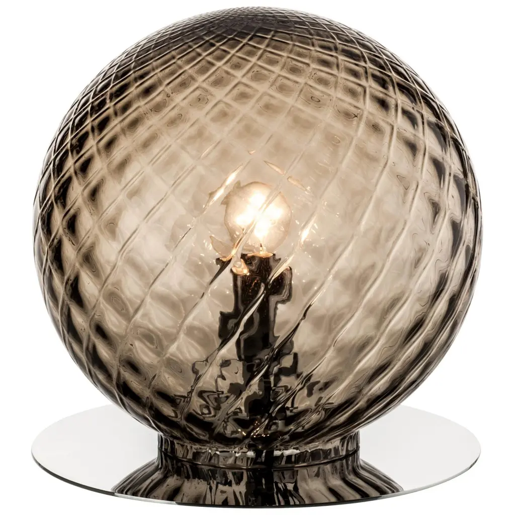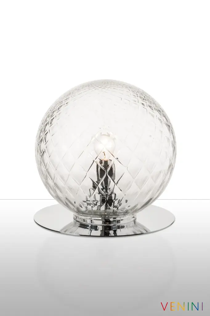 Balloton is a table lamp in hand-blown glass with the traditional balloton processing with a metal mold, for a cross relief effect. The latest re-edition features bright new elements, complex shapes and different uses. But it stays true to the Balloton technique, which lends a unique texture – pleasant to the eye and to the touch – to the glass surface: a rhomboid pattern etched with metal by the master glassblowers. The Balloton Lamp is available as a pendant light, a wall light and a table lamp.Colors:GreyCrystalLight source:1 x max 8W LED E14It seems soft, yet it is glass. This signature VENINI optical illusion is called Balloton: a unique process that recreates a quilted effect in glass. The “balloton” forming process is one of the most fascinating in the art of Murano glass making. In the most important phase of the process, the master glass maker has to blow the hot glass inside a special, thick metal mould before it solidifies. The mould creates the rhomboid shapes on the outer surface.