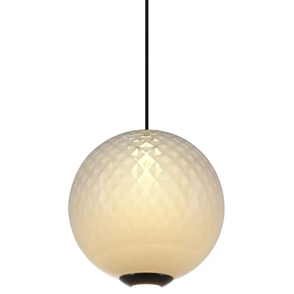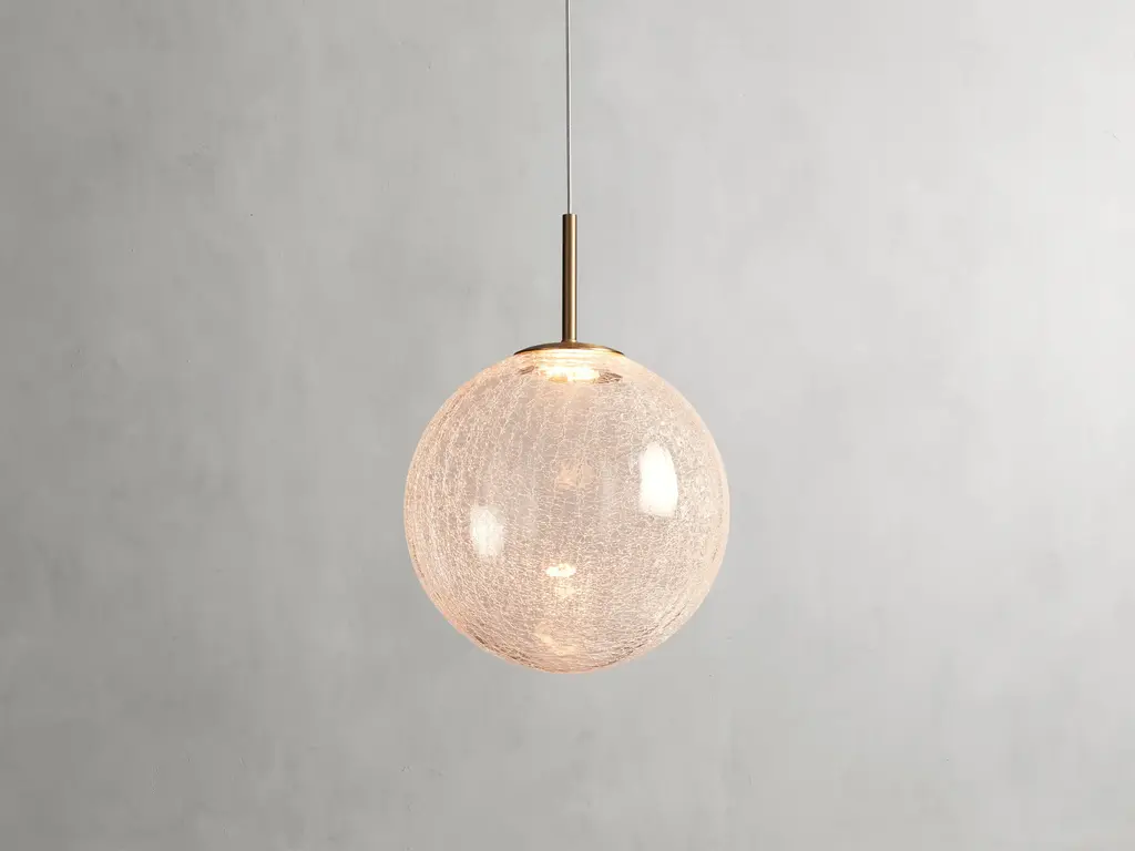 The particular cross-relief effect from which this collection’s models take their name is obtained by means of the “balloton” technique. During the hot work phase, the glass master blows the glass into a metal mould the interior of which is studded with pyramid-shaped points; as the molten glass fills up the void, it takes on this unique texture. Pendant light in blown glass, hand-crafted using the “balloton” technique. The structure is chrome-plated metal