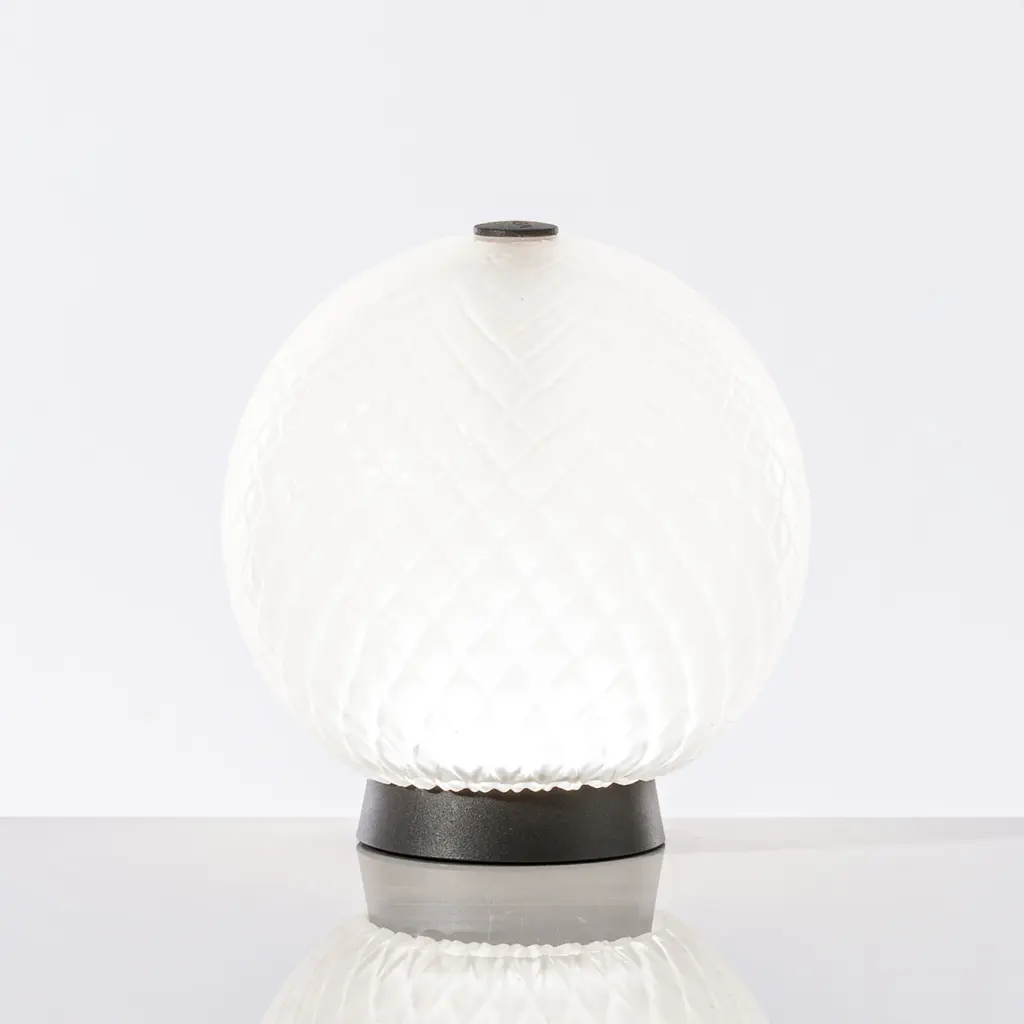 Elevate your space with the spherical beauty of the Balloton Table Lamp from Venini. Featuring a stunning "balloton" technique that creates a cross-relief effect on the glass, this stunning table lamp diffuses soft light in any space. Handcrafted by skilled glass masters using a metal mould with pyramid-shaped points, each lamp boasts a unique and luxurious texture. Experience the sophistication and exclusivity in one elegant design. Highlights