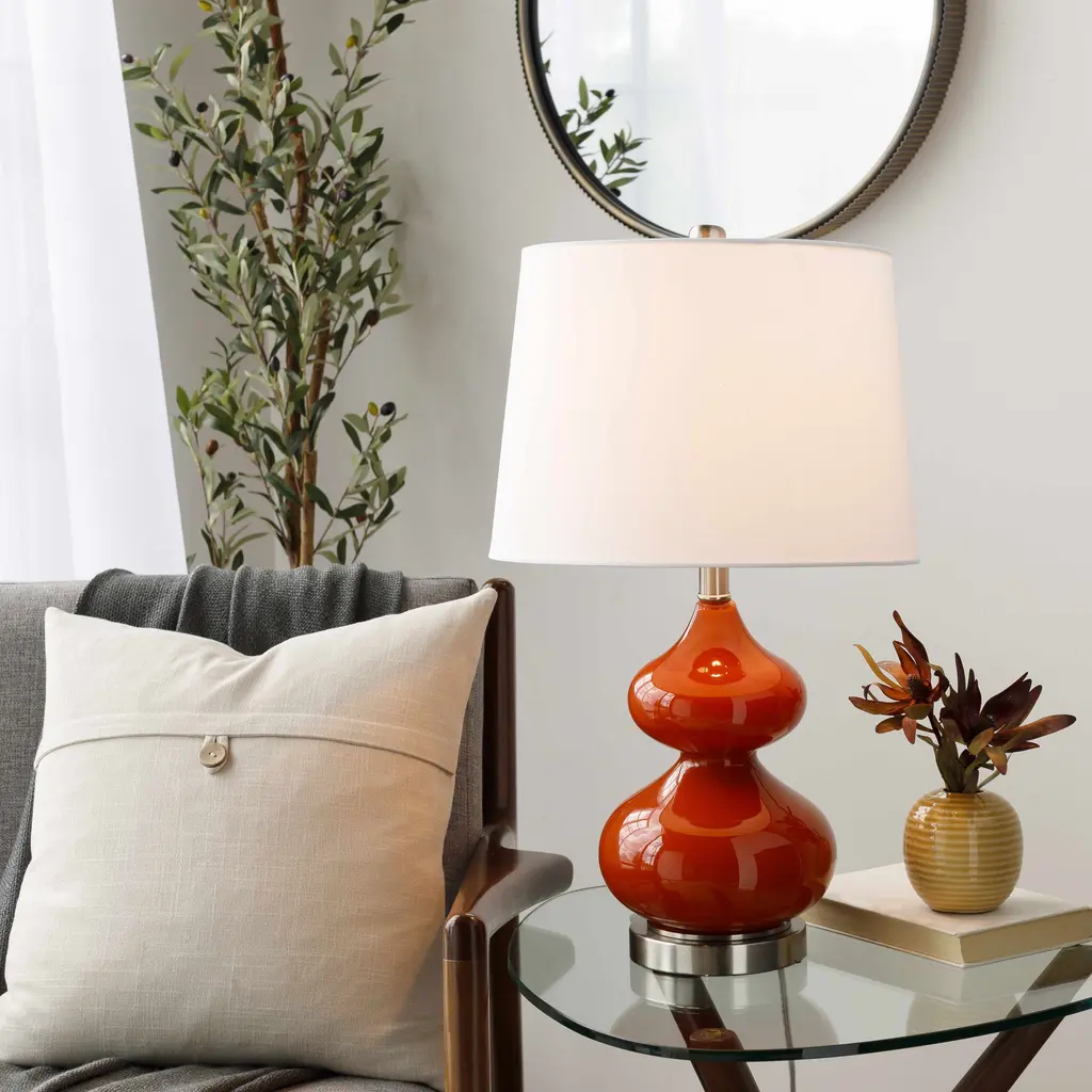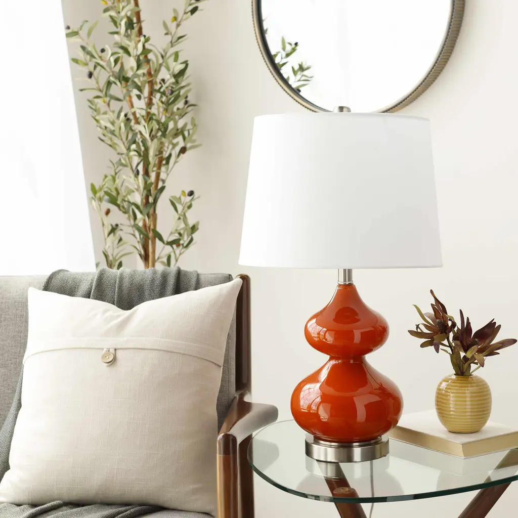 Collection: Ballyconnell Colors: White, Orange, Olive, Gray, Translucent Material: Body: Glass,Base: Metal,Shade (Outside): Linen,Shade (Inside): Polyester,Finial: Metal Styles: Contemporary,Traditional Made In: China