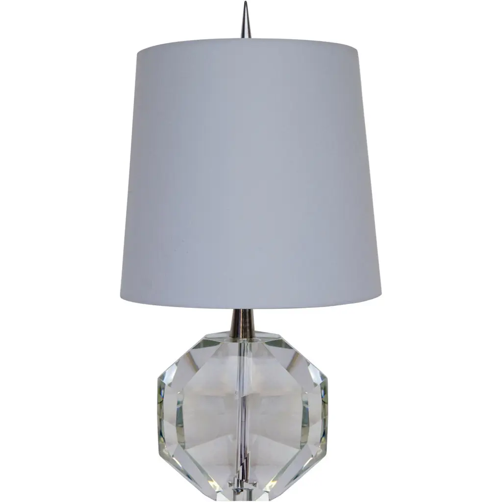 The Balustered Crystal Table Lamp is a stunning work of art made from the skilled hands of our master craftsmen. The piece is hand-carved from clear crystal to showcase an ornate pillar of faceted shapes, matched by a faceted ball finial at the top. The lamp features metal hardware in a Polished Nickel finish, contrasting the crystal-clear motif with cool metallic tones.