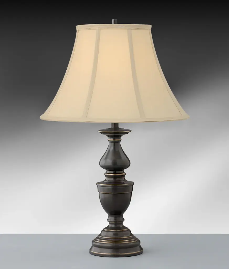Standard Lamp Specifications for #Z496:Product Type: Table LampHeight: 30"Finish: Madison BronzeConstruction: SteelSocket: (1) Aluminum 3-way Med. Base Type A 150W Max socket(s). (Bulb(s) not included)Switching: (1) 3-way turn knob switch(es) located on the socket.Cord: 7.5'' (from base) long black SPT-2 cord set with a 2 prong polarized plug.UL/CUL and/or ETL listed: YesHarp Size: 9.5 inches (including the saddle)Standard Packing: 2 per carton (shade packed separately).Lamps & Shades per SKU: 2Lamping: (1) Aluminum 3-way Med. Base Type A 150W Max socket(s).Shade Size and Description: Hand sewn shantung stretched silk shade with self fold trim measuring 9" x 18" x 12" w/ .5" drop (Top x Bottom x Slant).Bulb Included: NoMaterial Description: constructed from polished, plated, and lacquered steel.