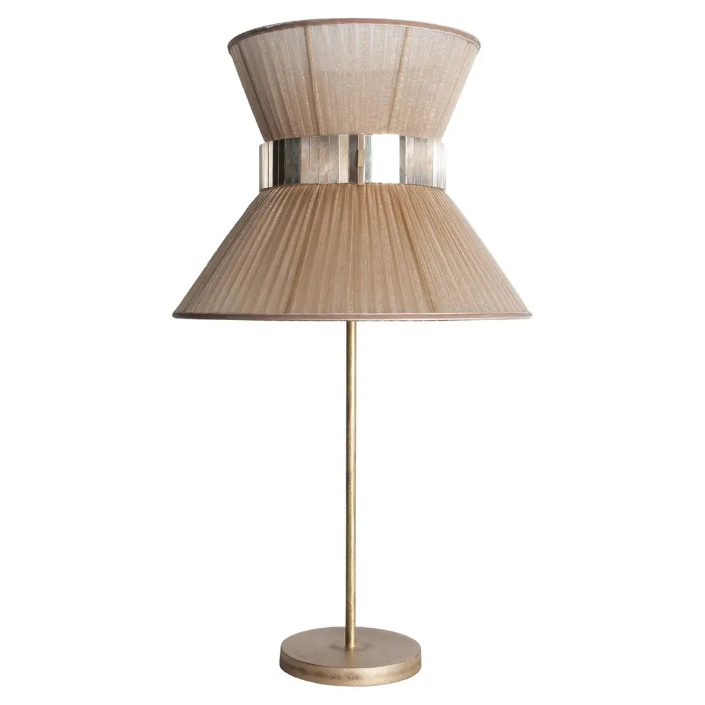 Paired with a silver fabric drum shade and polished metal frame, this glamorous table lamp will brighten up any contemporary interior with its sophisticated design. The defining feature is the slender stem, supported by a circular base, embraced by bamboo-shaped brass elements encased in clear Murano glass that offer texture and glittering shine. The shade is lined with PVC and diffuses ambient light from a single E27 LED bulb.