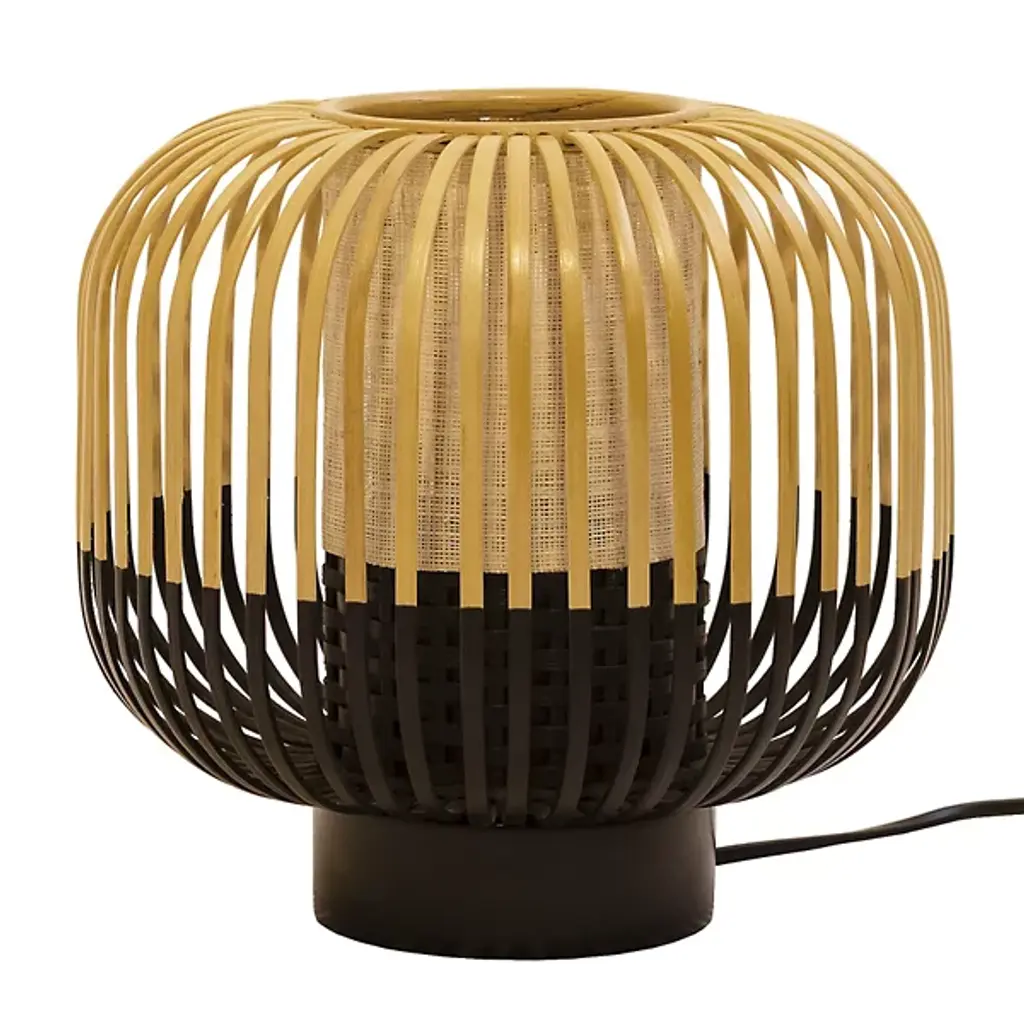 Natural materials and hand-painted accenting make the Bamboo Table Lamp by Forestier a lively addition to a modern home. From Israeli designer Arik Levy, this piece brings artisan-crafted style to a space through its lantern-inspired silhouette. Partly painted bamboo bars form a cage around a central diffuser and are set atop a cylindrical base in a matching finish. Its lamping is concealed within the woven fabric diffuser, emitting a pleasant glow that evokes the mood of a festive summer picnic.