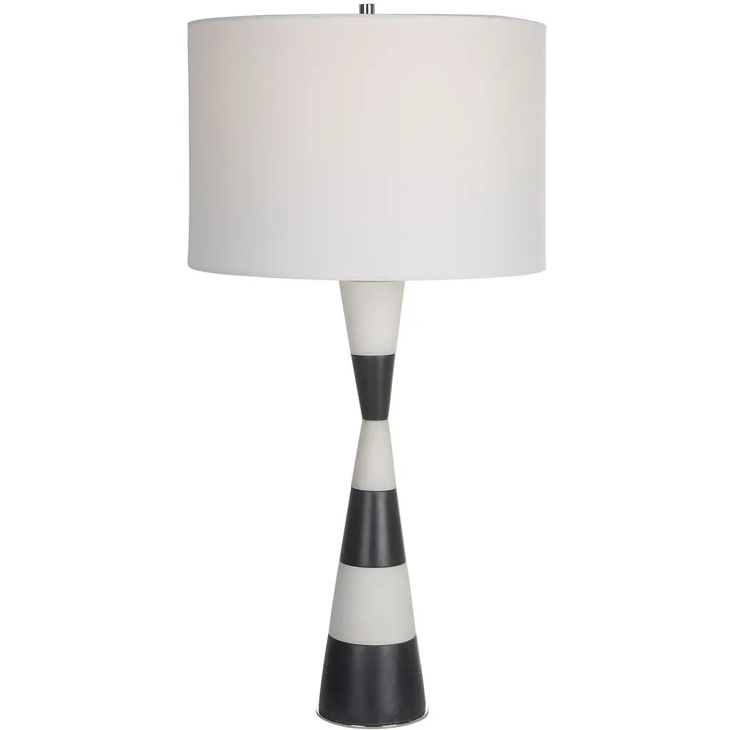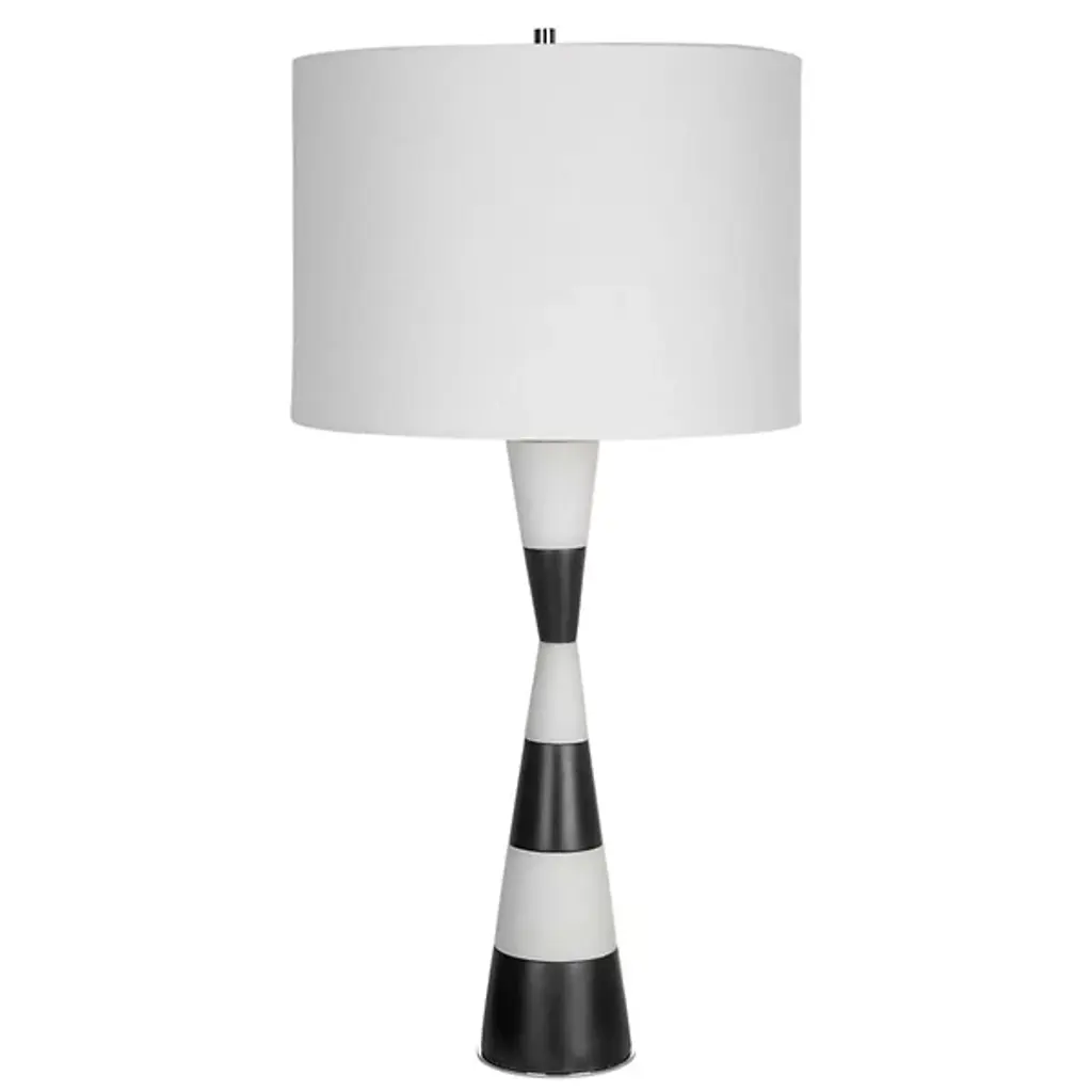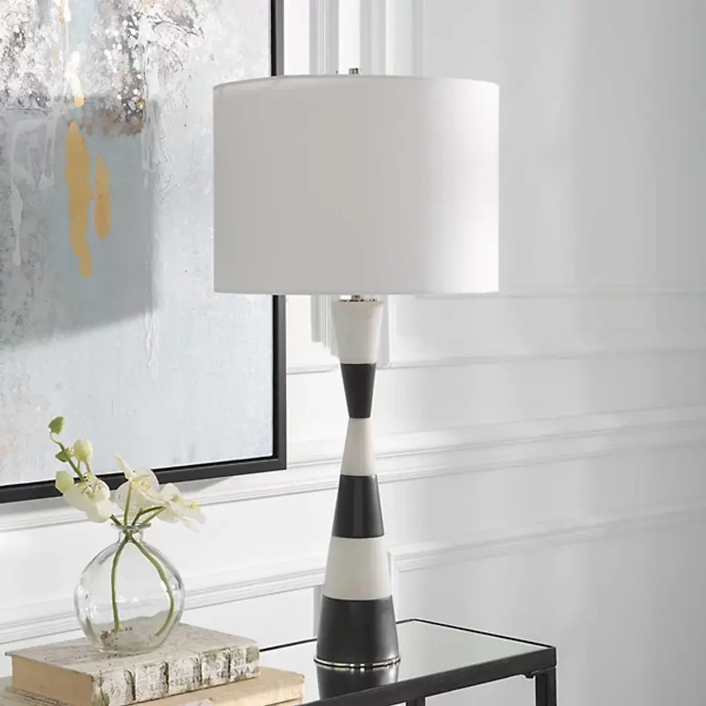 The Bandeau Table Lamp from Uttermost delights with a striking hourglass shape crafted from banded black and white composite stone that closely resembles Thassos marble. Designed by Carolyn Kinder, it uses polished nickel-finished iron details to add a welcome note of elegance, while a white linen drum shade completes the look. This lamp embodies a transitional style, blending classic and contemporary elements to create a sophisticated design that combines durability and visual appeal.